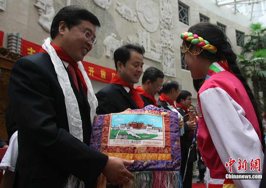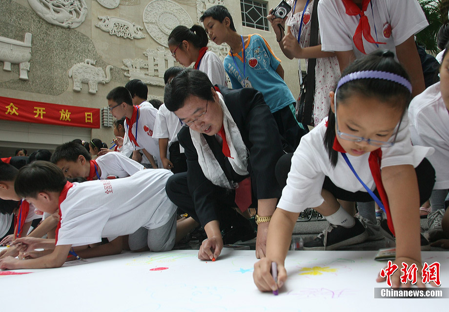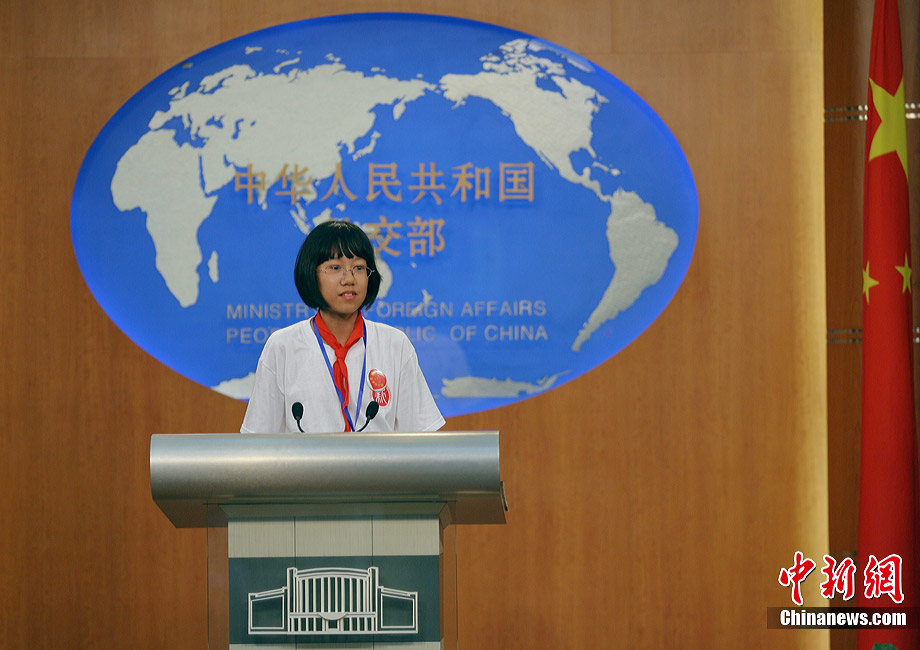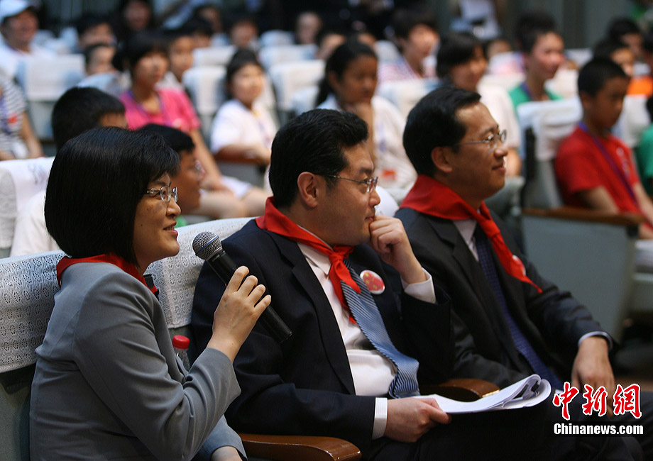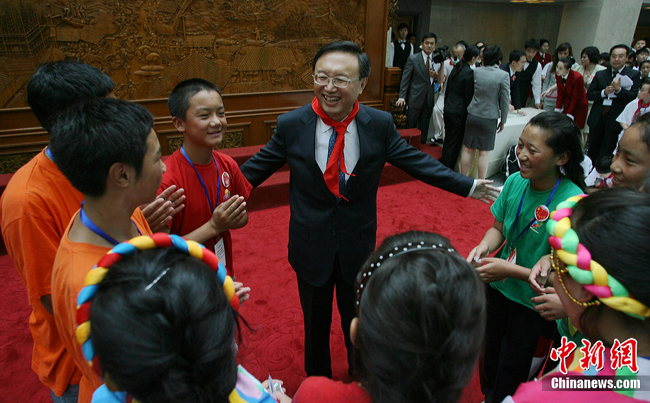 7月17日,在外交部橄榄厅,外交部长杨洁篪勉励玉树震区小学生努力学习、重建家园。当日,外交部举办第八次驻外使节任职宣誓仪式暨外交部“祖国在我心中”主题公众开放日。来自北京、玉树、黑龙江、重庆等地的小学生参加了此次活动。中新社发 苏丹 摄
