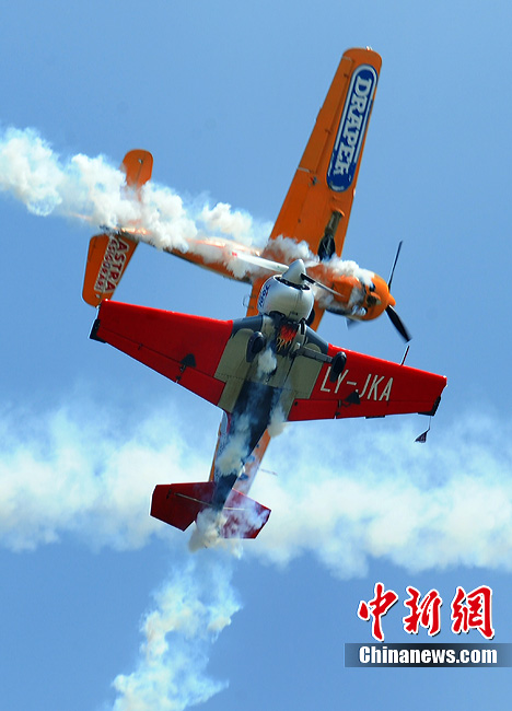 当地时间7月17日,来自世界各地60多架老式飞机参加了在罗马尼亚首都布加勒斯特北郊亨利·科安达国际机场举行的2010飞行表演。