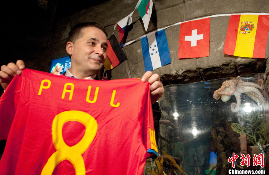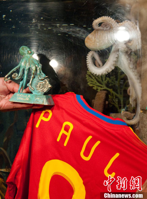 近日,曾在2010年南非世界杯上大放异彩的“章鱼哥”保罗再获殊荣。西班牙卡瓦利诺市市长在德国奥博豪森水族馆正式赠送给保罗一件印有它名字的西班牙队队服和保罗自己的青铜像,称保罗为“城市最好的朋友”。