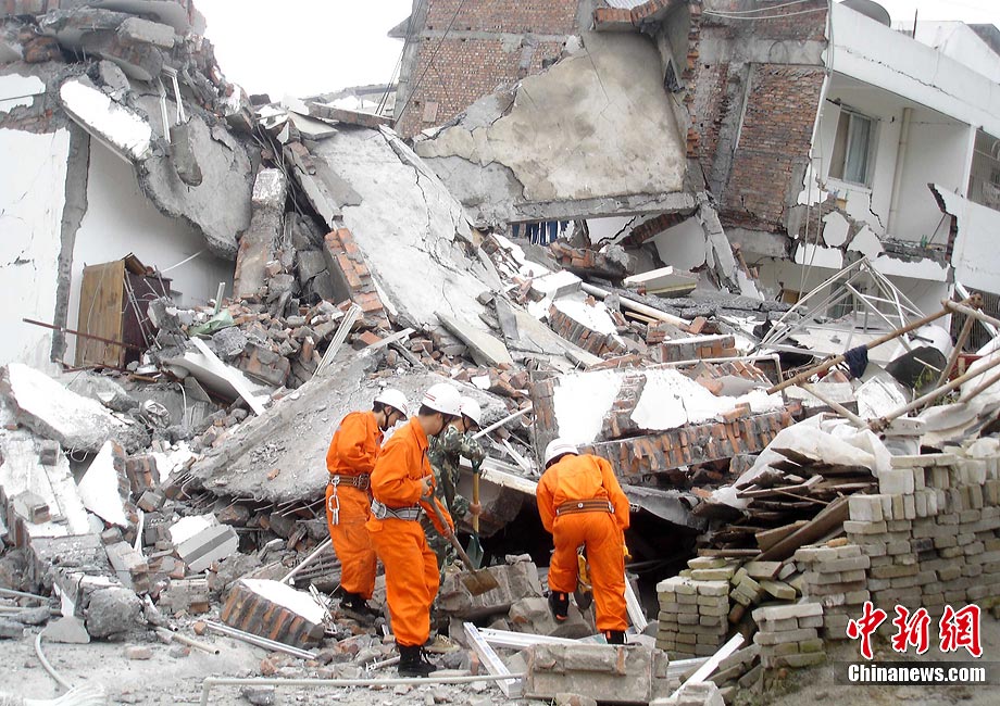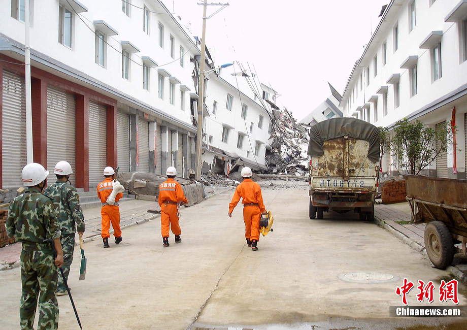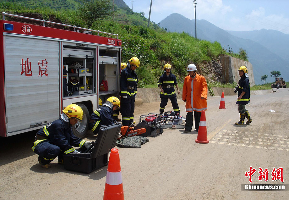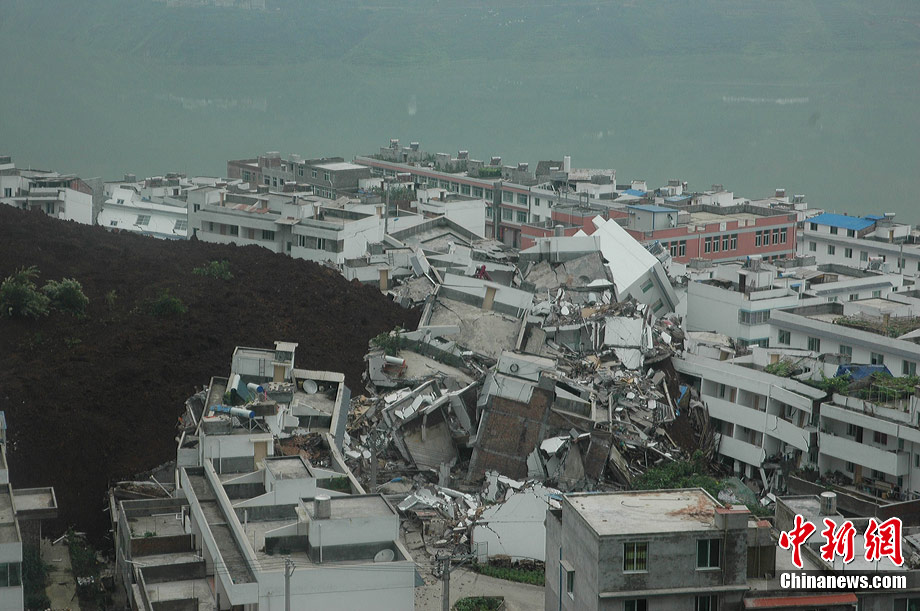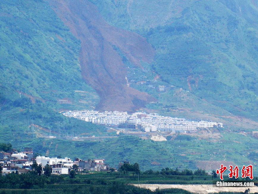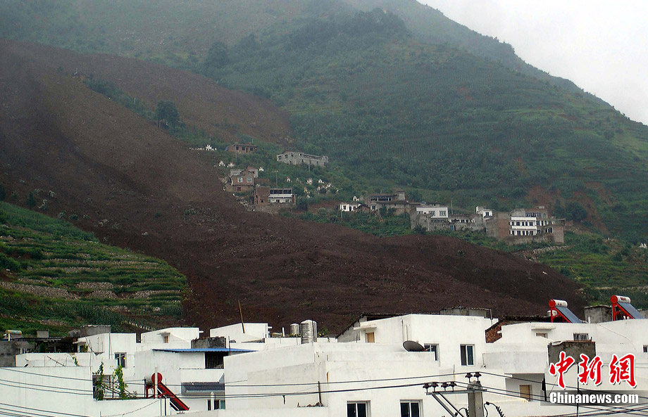 7月27日凌晨5时许,因连日来的持续强降雨和暴晴天气,四川雅安市汉源县万工乡双合村一组万工集镇后背山(小地名二蛮山)突发滑坡,方量约10万方,造成万工集镇、双合一组部分村民房屋垮塌。初步核实共有58户房屋受损、21人失踪。初步勘明强降雨形成的新滑坡推移引发泥石流,方量约10万方。由于垮滑现场实施救援较为危险,滑坡暂时被房屋挡住,随时可能推到房屋再次下滑,救援人员已经全部撤离。灾害发生后,当地迅速调集武警、消防等98人赶赴现场救援,还有230人待命。目前,帐篷、食品、饮用水等救灾物资已陆续运往临时安置点,尚未发现新增失踪人员。图为山体垮滑现场。中新社发 孙浩 摄