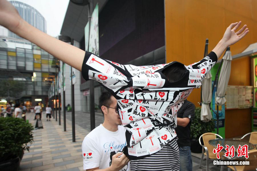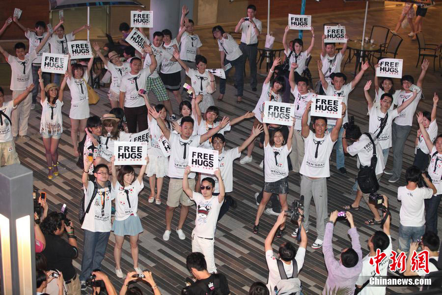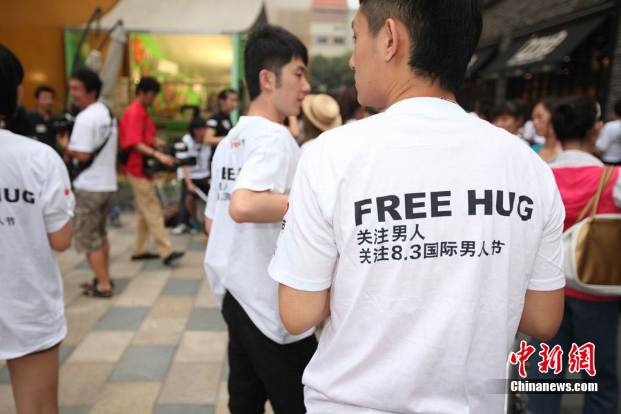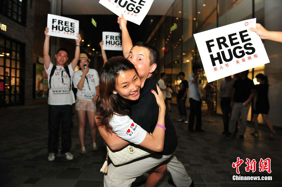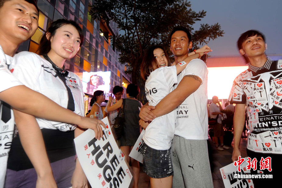 8月3日晚,在北京三里屯,俊男靓女们举起Free Hug(免费的拥抱)的大牌子,向陌生人们发起了自由拥抱的邀请,现场千人不分男女老少相互拥抱致意。“Free Hug”活动起源于欧美,是一种倡导关心和理解的交流方式。中新社发 李学仕 摄