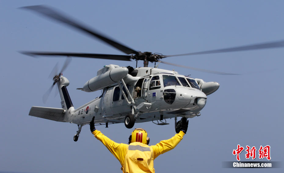 8月5日,韩国海军舰艇和直升机参加在朝鲜半岛西部的韩国海域单独举行的反潜演习。