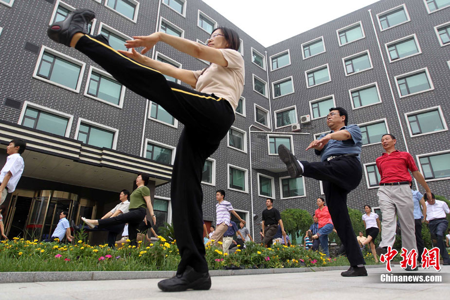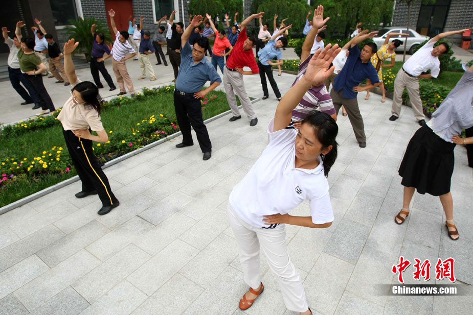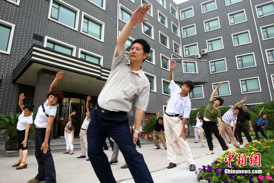 8月9日,北京化工集团的职工在工间时段集体做广播体操。当日,北京恢复广播体操,电台在每天10时和15时连续播放两次第八套广播体操音乐,时长为8分钟左右。此次,北京市总工会定下目标,2011年全市职工参与健身活动比例要达到60%以上,国有企业参与工间或工前操活动要达到100%,机关事业单位要达到70%。中新社发 富田 摄