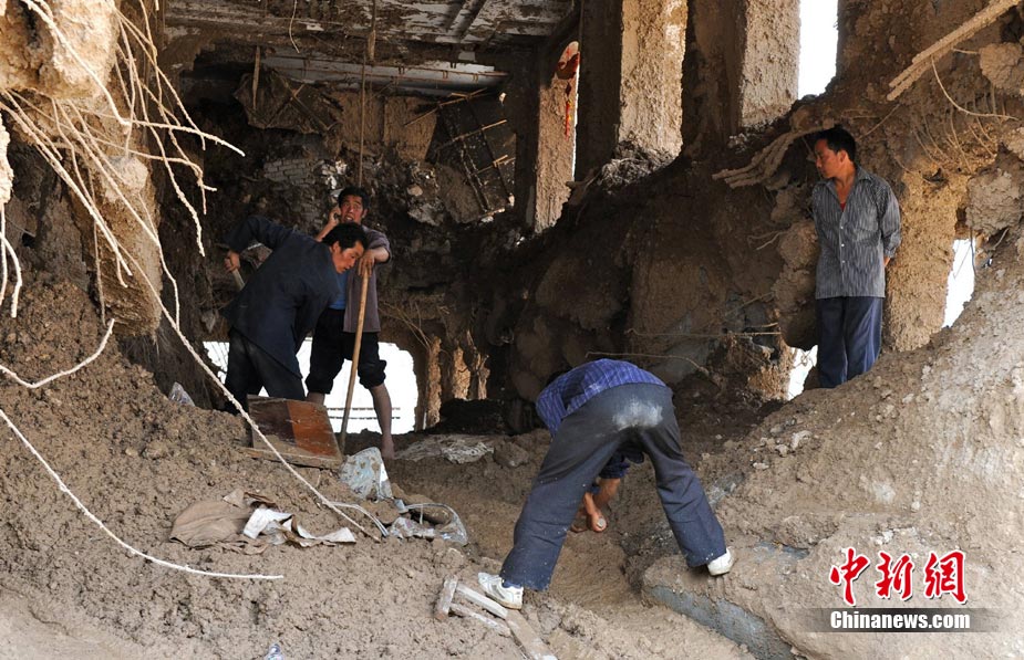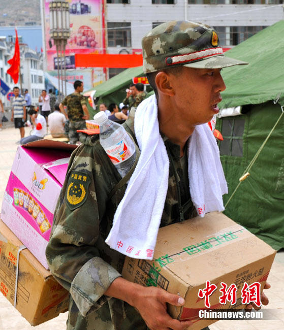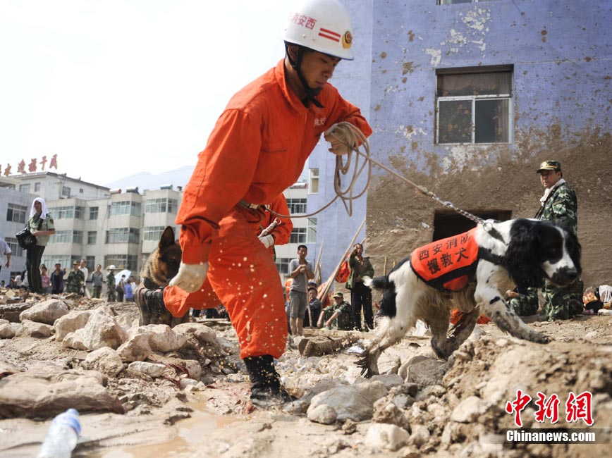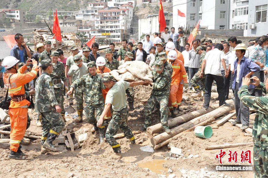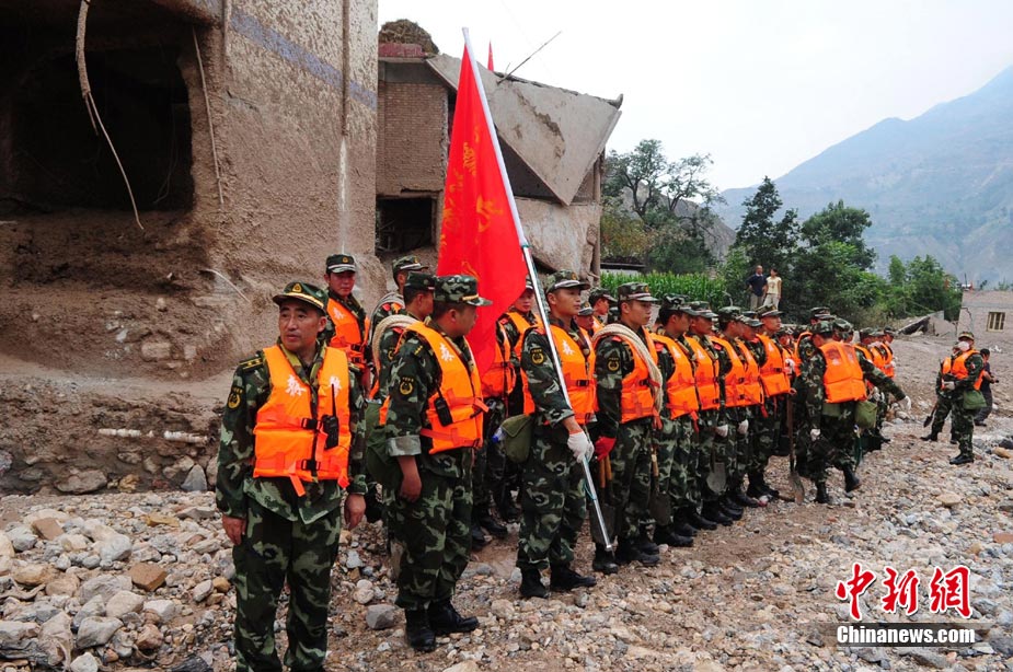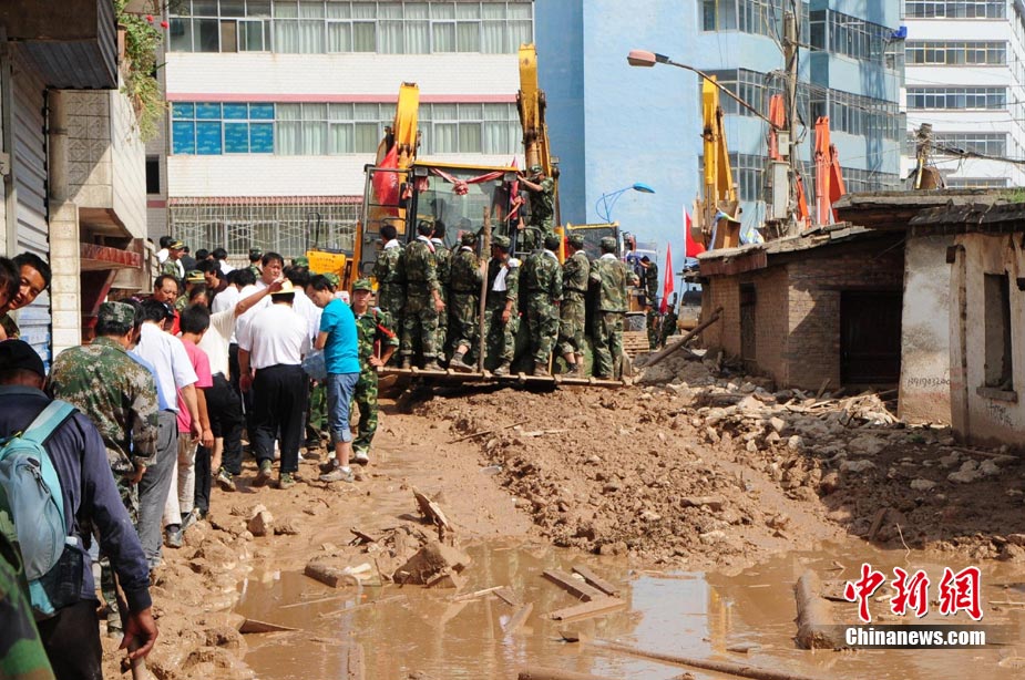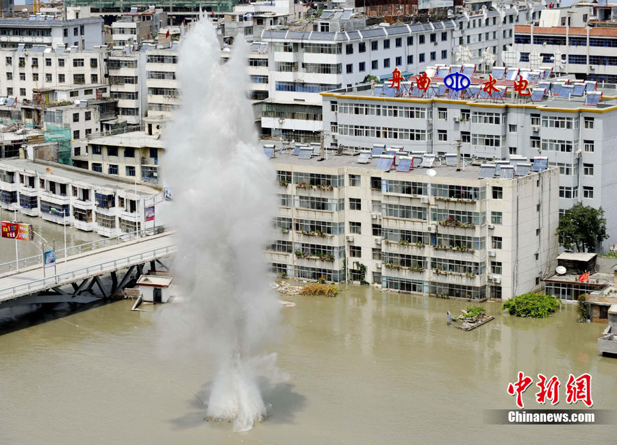8月10日,甘肃舟曲泥石流灾区,兰州军区开山斧工兵团在泥石流造成的白龙江堰塞湖坝体上实施爆破。中新社发 廖攀 摄