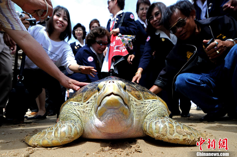 12日是泰国王后诗丽吉的78岁生日,泰国各地纷纷举行活动庆祝王后生日。图为一家海龟保护中心,专门举行活动将700多只海龟放归海洋,为庆祝泰国王后生日。