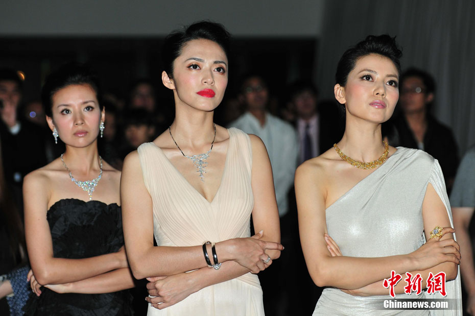 8月12日晚,永恒印记“Shining Light”钻饰设计大赛获奖作品全球首展在北京举行。30位来自南部非洲的年轻设计师以25000颗总重达630克拉的美钻向世界展示了他们在钻石设计领域的极致才华。姚晨(中)、高圆圆(右)、董洁等艺人盛装前来助阵。中新社发 李学仕 摄