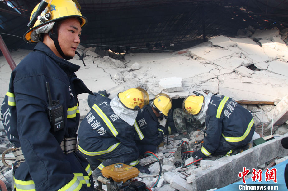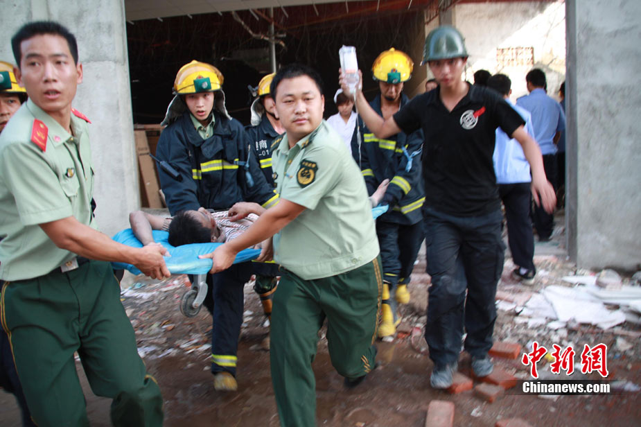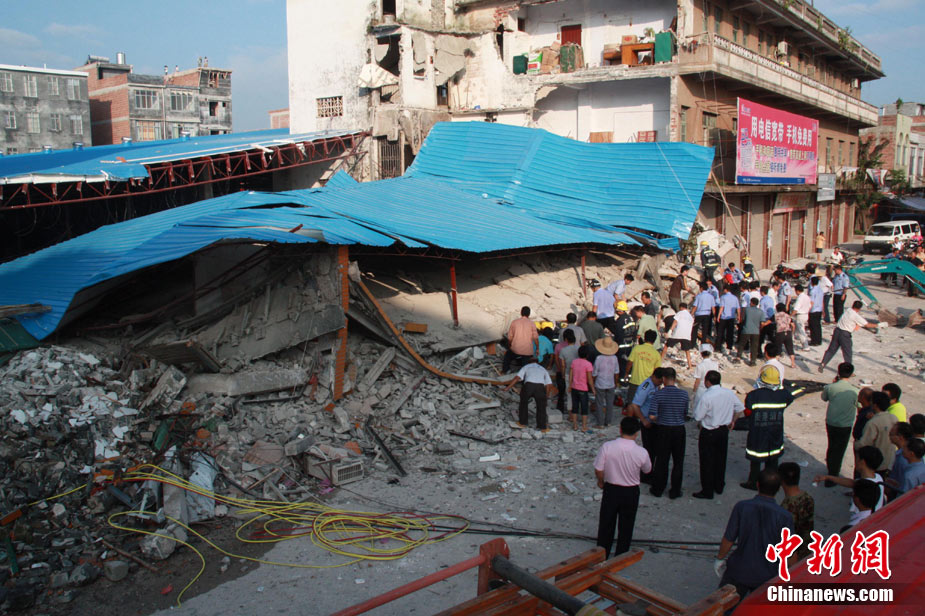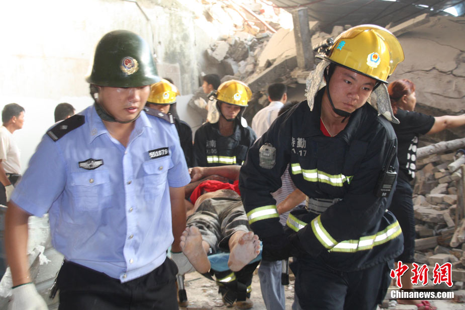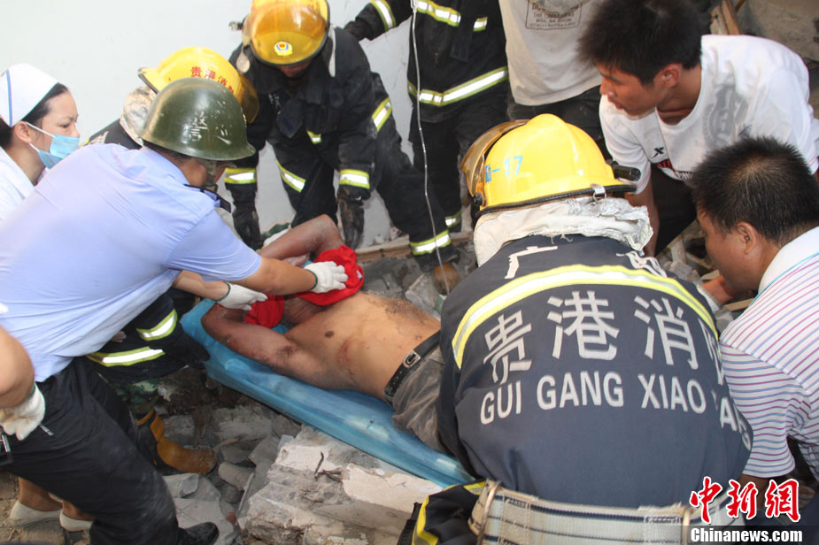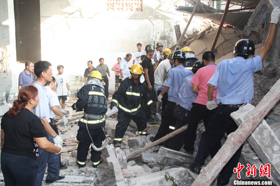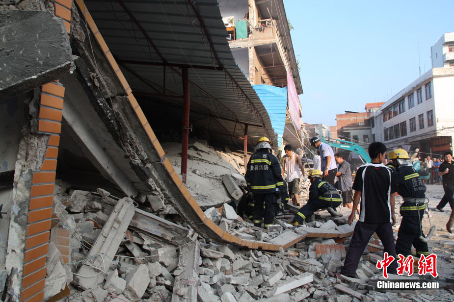 8月13日早晨,广西贵港市桥圩镇供销社百货门市部一栋3层的楼房突然倒塌,造成12名住户被埋废墟中。至上午10时50分,已知被埋人员被消防官兵全部救出,事故造成3人死亡9人受伤。中新社发 杨文福 摄
