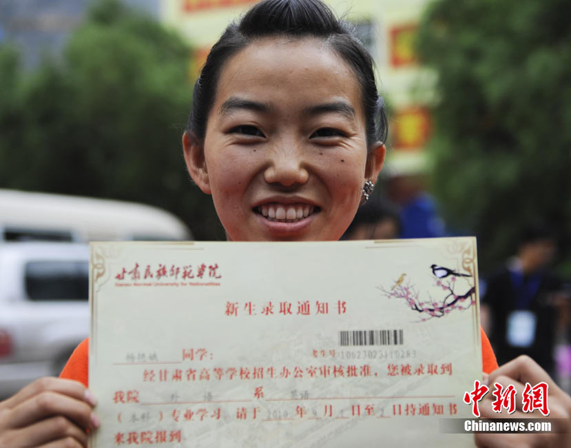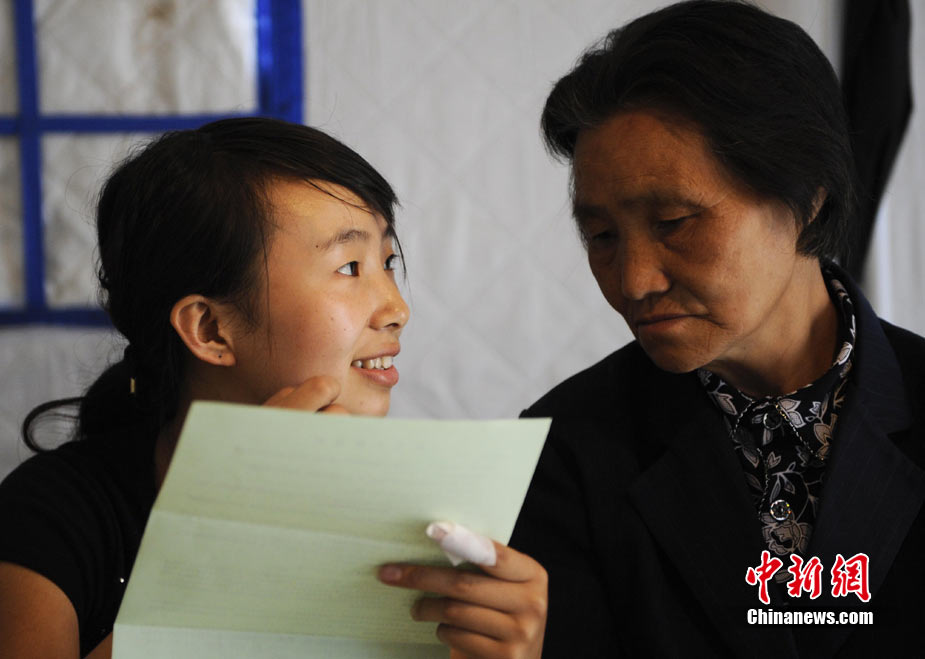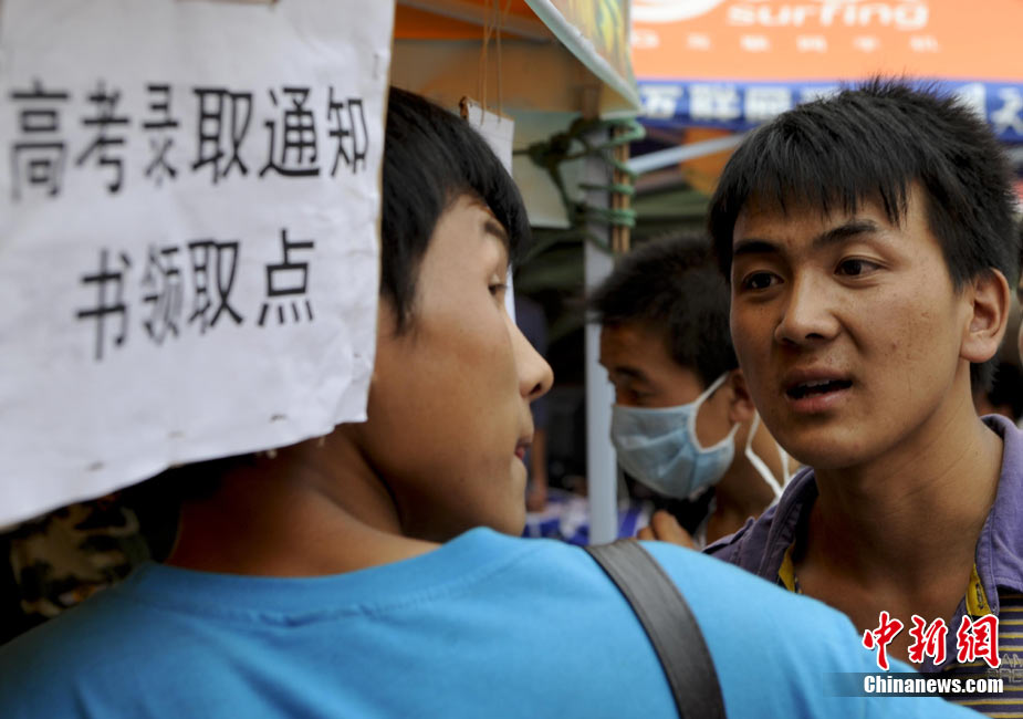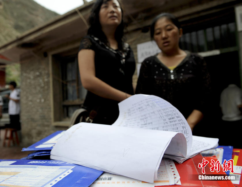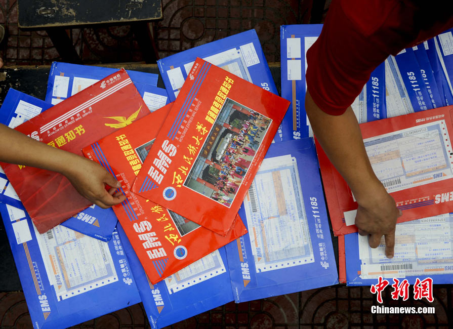 8月14日,甘肃舟曲灾区的高考录取通知书正在发放过程中,学生们接过火红色的录取通知书信封,眼里有藏不住的笑意。然而,有一些通知书却永远无法发出了。截至上午10点30分,舟曲一中收发室当天共发出7份录取通知书,还有30多封正等待领取。中新社发 廖攀 摄