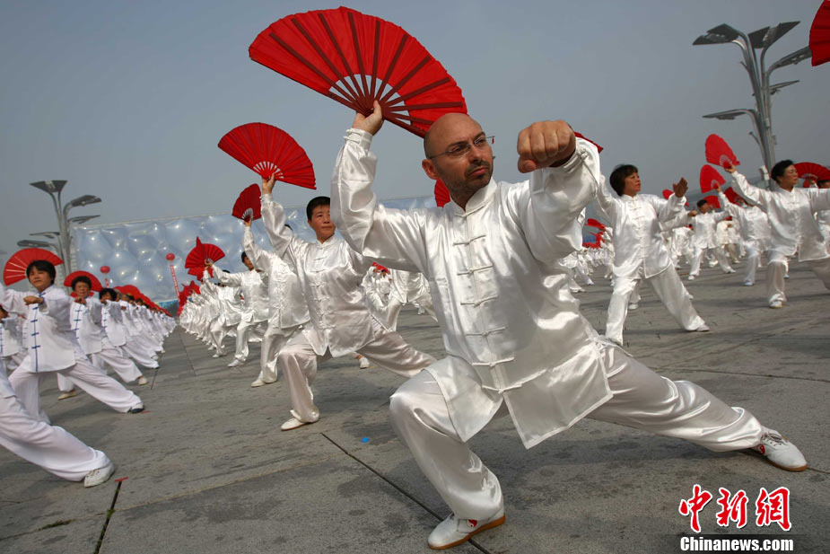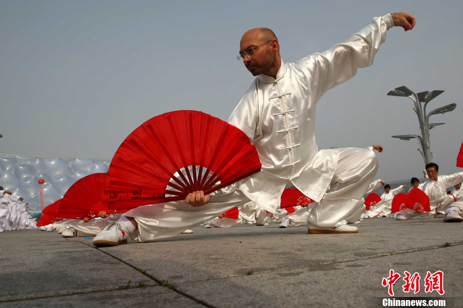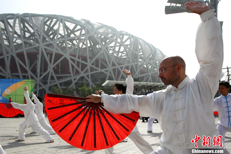 8月14日,为庆祝8月8日全民健身日和纪念北京奥运会举办两周年,“北京奥运城市体育文化节--万人健身气功展示活动”在北京奥林匹克公园景观大道举行,近万名中外民众展示了五禽戏、八段锦和太极功夫扇三段健身气功。图为来自西班牙的中国气功爱好者卡洛斯参与展示,他从2006年开始每年都要来中国三个月专心学习中国气功。中新社发 富田 摄