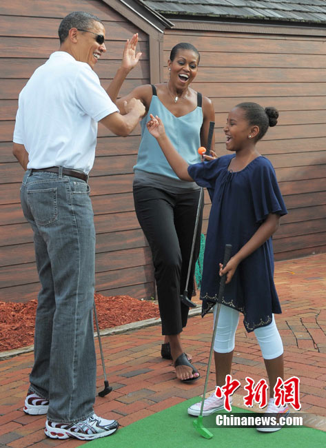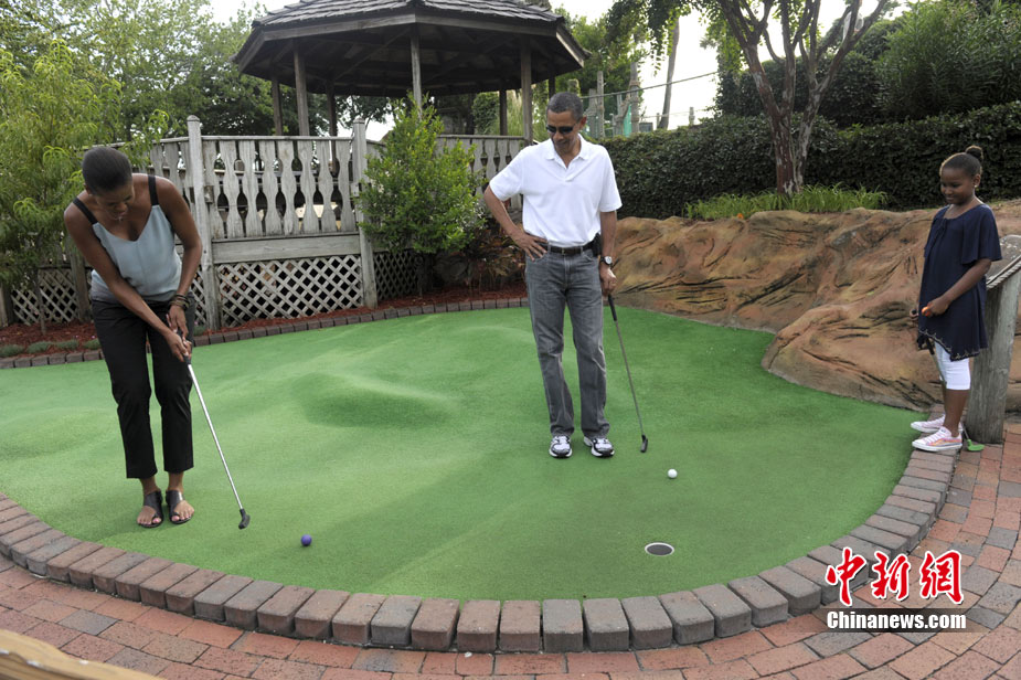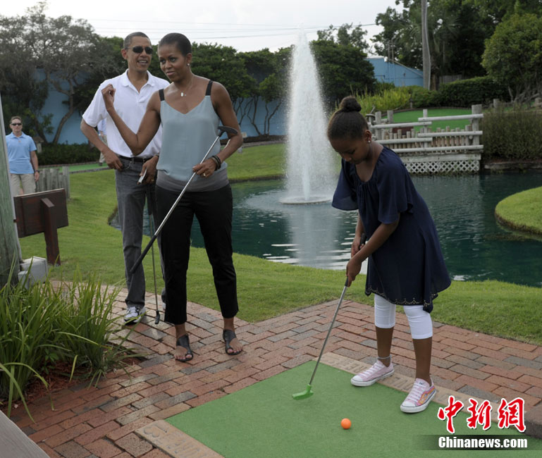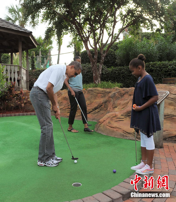 近日,奥巴马到佛罗里达巡视墨西哥湾油污清理作业、推销当地观光的机会。14日,他带着妻女到佛罗里达一个迷你高尔夫球场散心, 全家一起上阵,小试身手。