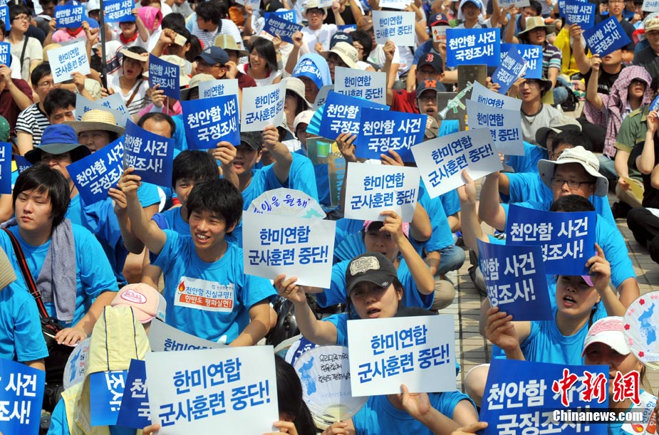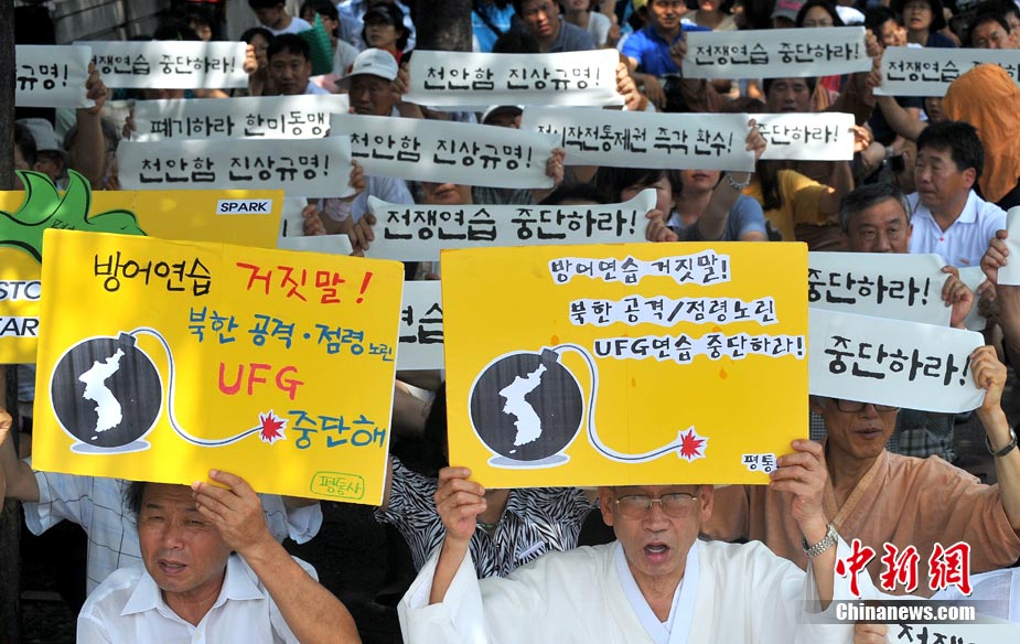 8月15日,在韩国首都首尔,韩国民众在战争纪念馆前集会,反对韩国与美国举行代号为“乙支自由卫士”的联合军演。