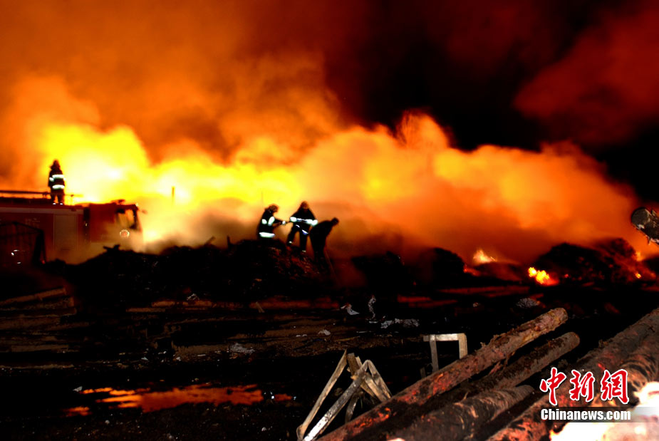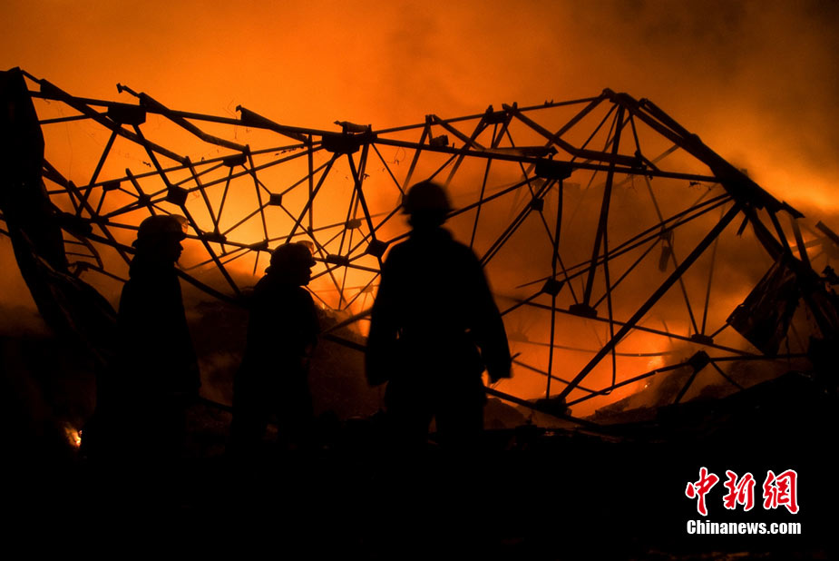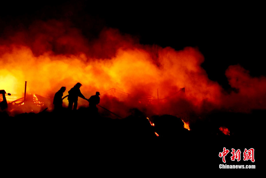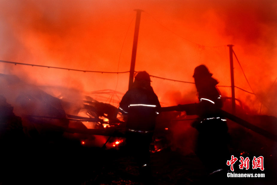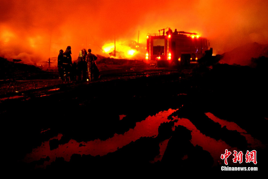 2010年8月16日9时40分左右,黑龙江省伊春市乌马河区华利实业有限公司鞭炮厂发生持续爆炸。爆炸发生后,伊春市委、市政府紧急启动爆炸事件、医疗救护应急处置预案,紧急调派公安、消防、医疗救护、武警部队、驻军部队2000余人及时进行抢救,经过8个多小时的奋力鏖战,因爆炸引起的火灾已全部扑灭。截至17日零时,发生在当地乌马河区的鞭炮厂爆炸已造成19人死亡,5人失踪,住院伤者153人。准确原因正在进一步调查之中。图为16日夜23时30分,武警消防部队官兵不辞辛苦仍战斗在火场一线清理残火。陈刚 摄