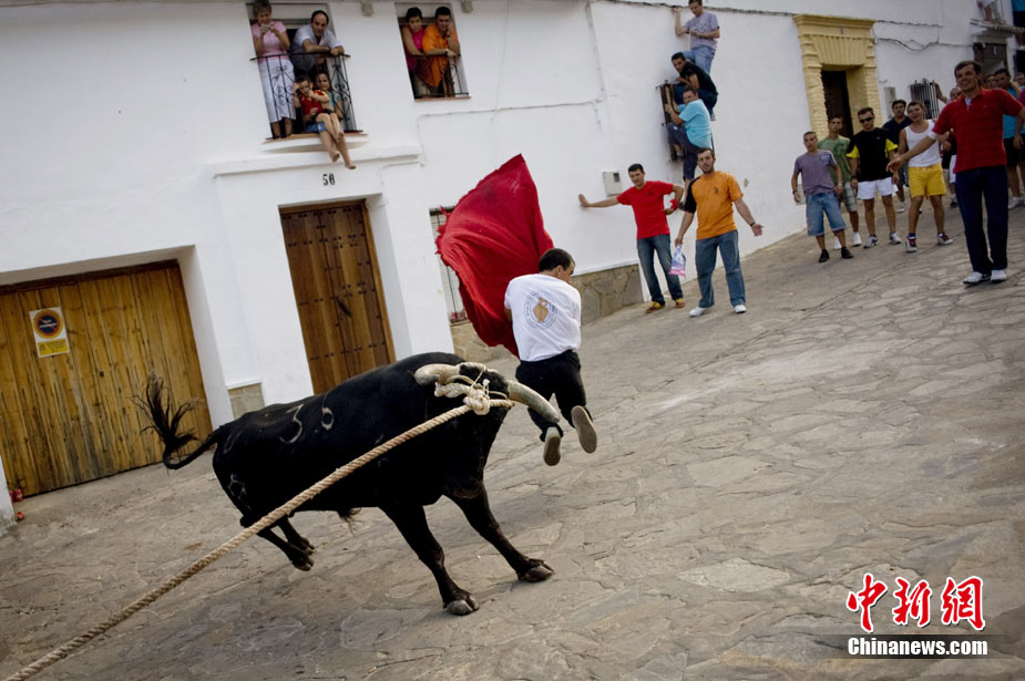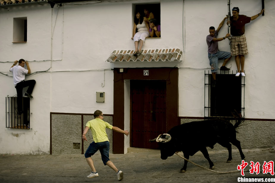近日,西班牙罗萨里奥一个小城的居民在村中街道上玩起了斗牛。勇敢的年轻人一边挑衅愤怒的公牛,一边纷纷跳上房屋躲避。上演了一场街头斗牛。