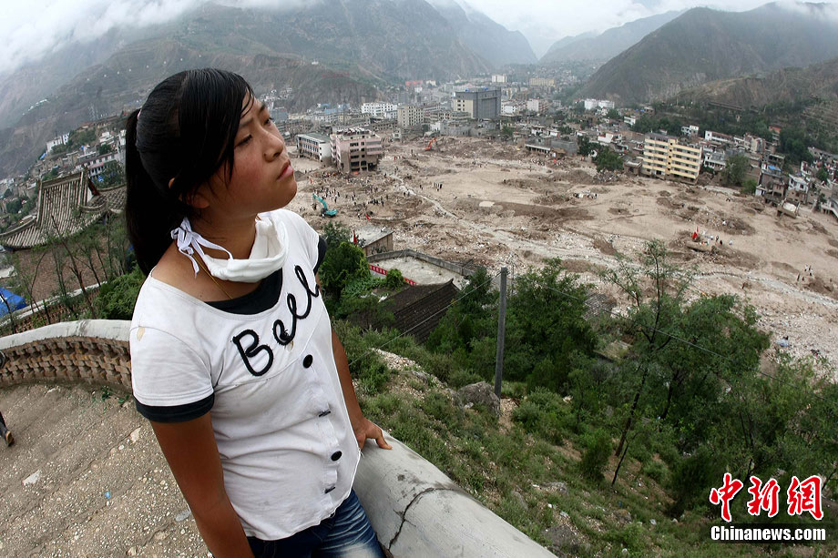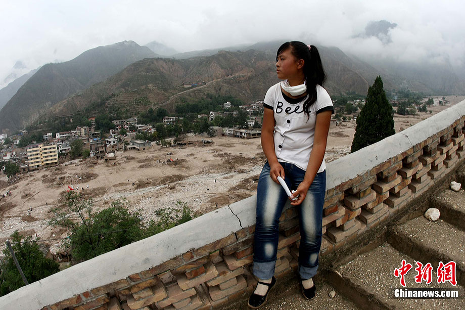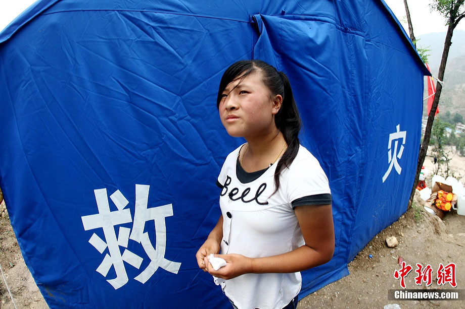 8月17日,甘肃舟曲县月圆村14岁女孩尚蕊丽度过了灾后的第10天,带着忧郁的眼神等候失踪亲人的消息。8月7日晚,尚蕊丽和几名邻居在为自家玉米地浇水,当她们在帐篷中躲雨时爆发了特大山洪泥石流,尚蕊丽拼命奔向数百米远处一栋二层小楼,幸免于难。在闪电中,她远远看见自家房屋所在位置被夷为平地,一排排房子像骨牌一样被推倒,尚蕊丽成了家族中惟一的幸存者,家中16位亲人遇难。中新社发 杜洋 摄