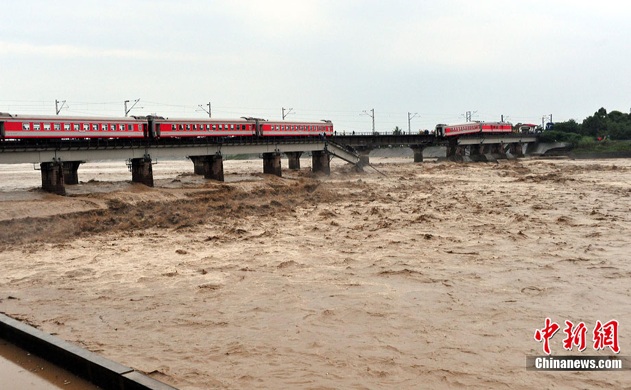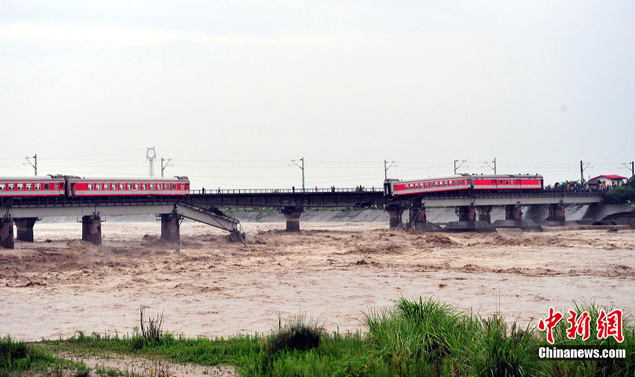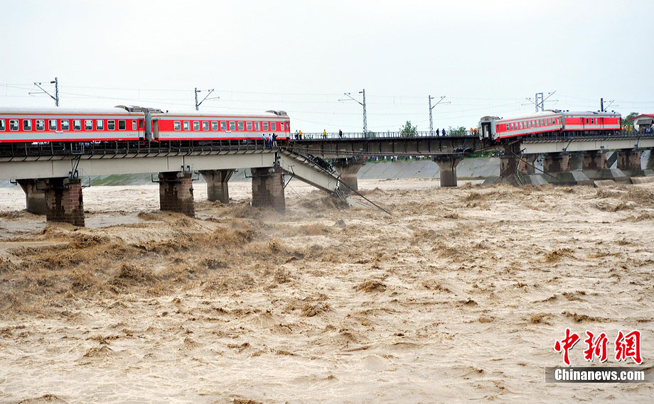 中新网成都8月19日电(杨杰 周迪迪 田甜)19日下午15时20分,从西安开往昆明的K165次列车两节车厢在四川广汉市境内掉进石亭江,被洪水冲出200米远。经过紧张的营救,车上人员已全部安全转移,未出现人员伤亡。安源 摄