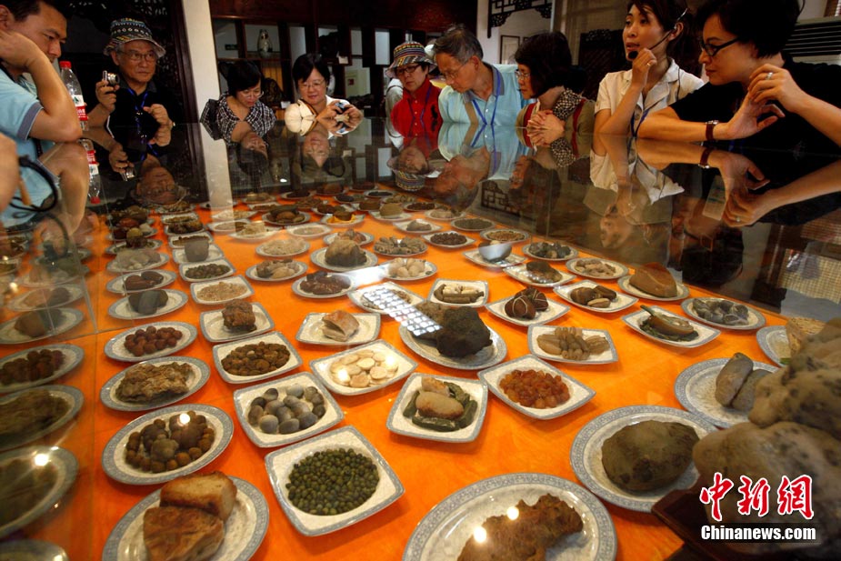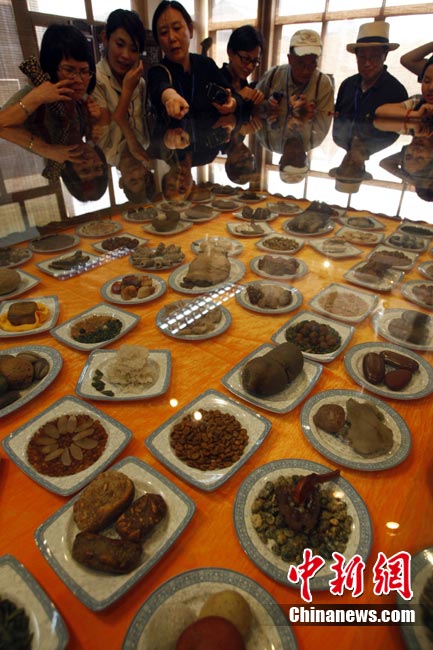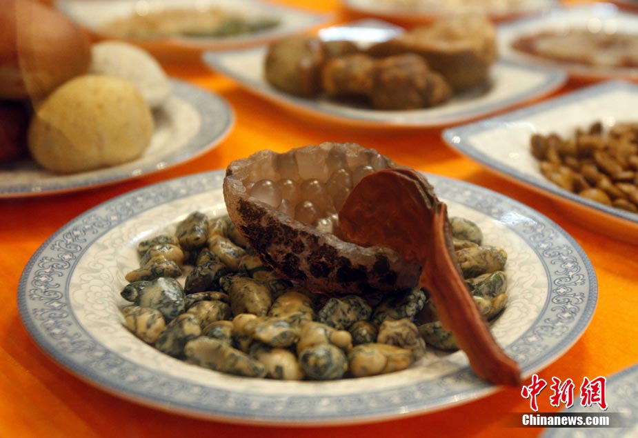8月20日,游客在广西柳州八桂奇石馆欣赏“满汉全席”。这些栩栩如生的各式奇石酷似美食佳肴,令游客垂涎欲滴。中新社记者 张宇 摄