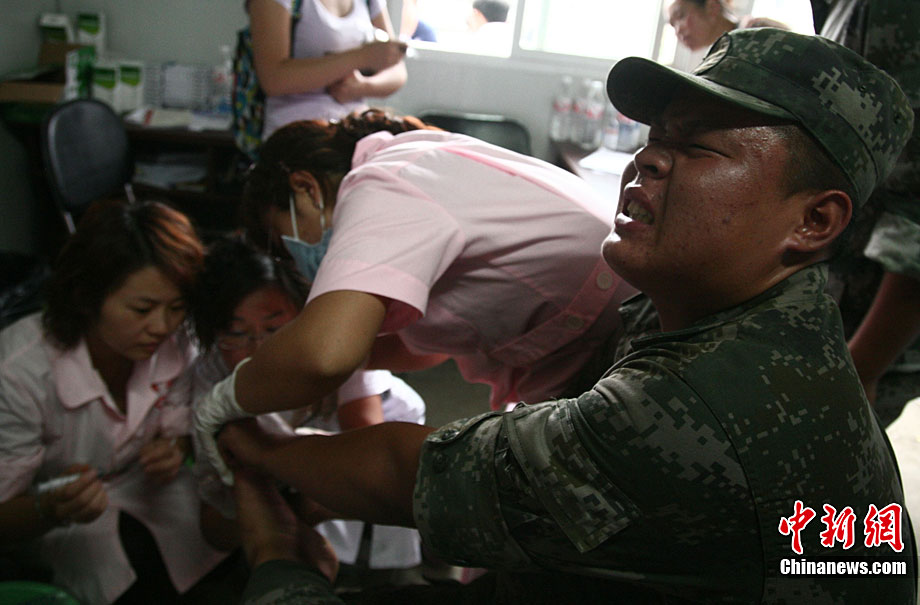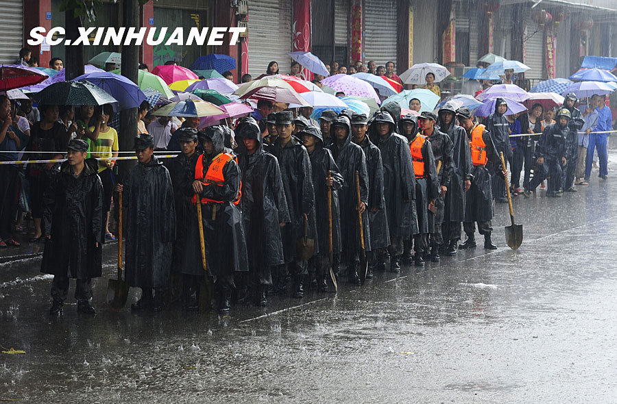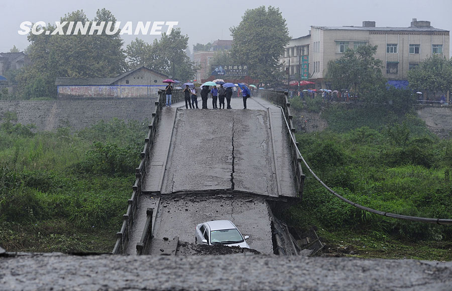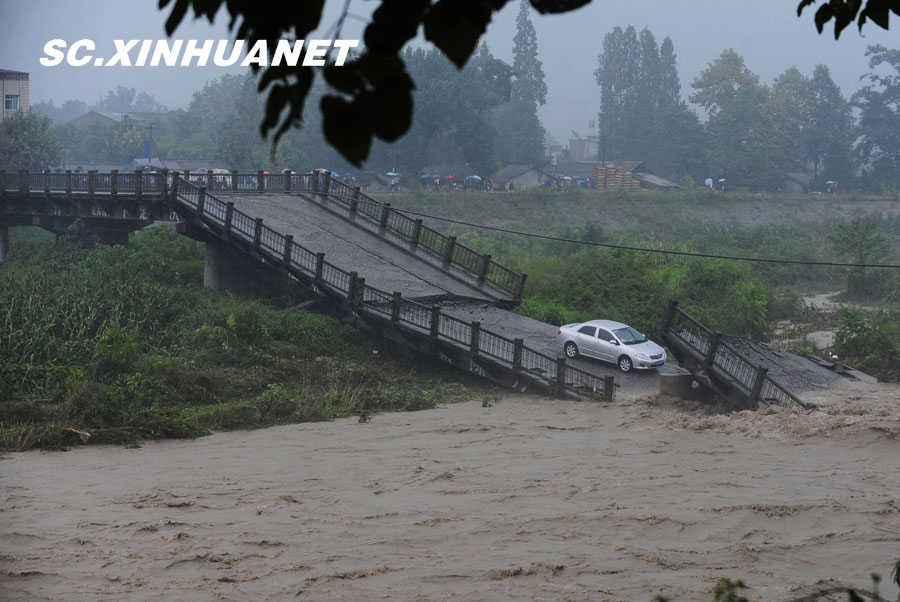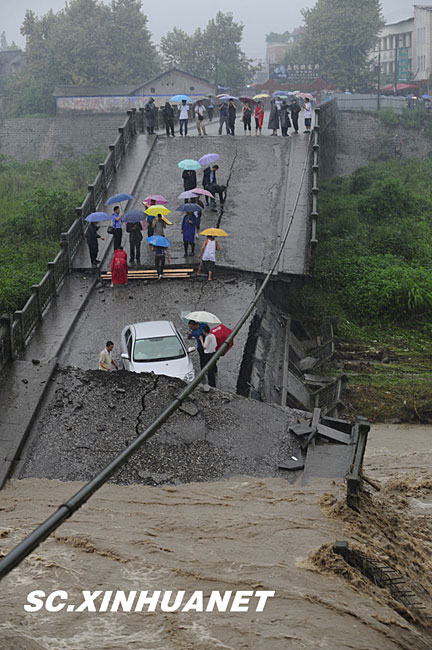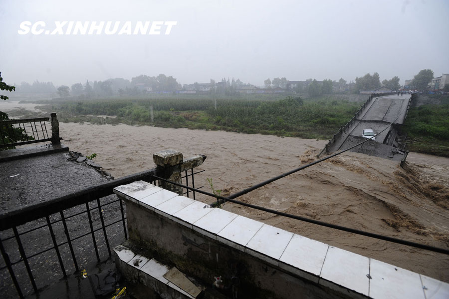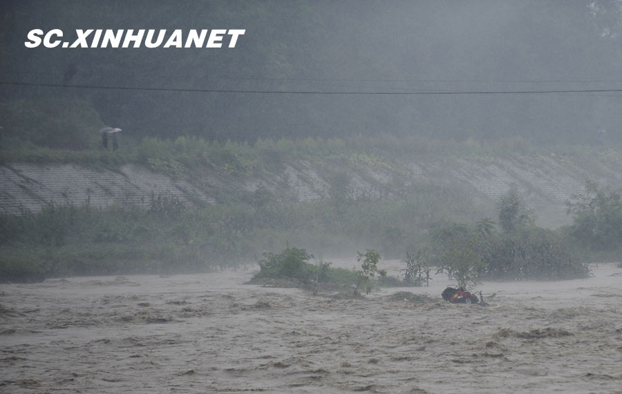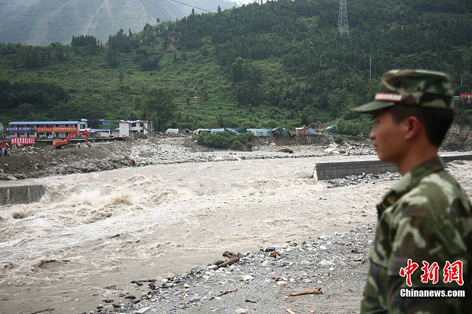 8月19日晚10时许,洪峰再次通过汶川县映秀镇,突如其来的洪峰冲垮了映秀镇堰塞体旁的防护栏,造成该段岷江水位下降,湍急的水流转向冲刷映秀镇新城河堤,抢险队已用装有石料的铁丝网围住河堤以保护映秀镇新城。图为已冲毁的岷江防护栏。中新社发 张浪 摄