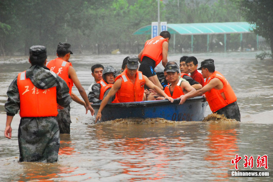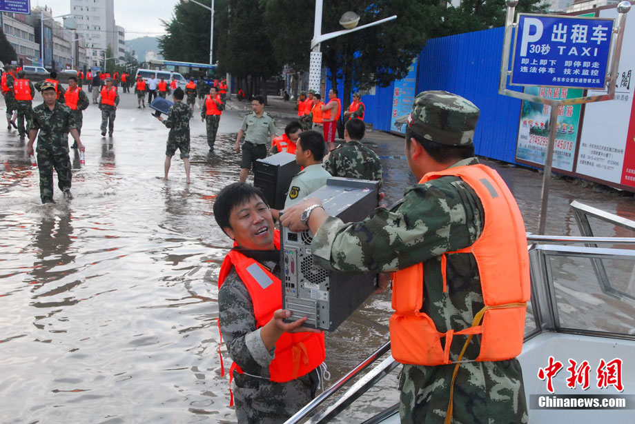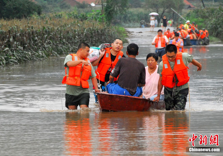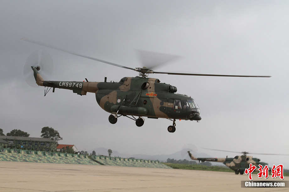 由于降大暴雨,辽宁丹东地区严重受灾,部分县市交通、通信、电力中断。8月22日11时40分,两架军用直升机从丹东机场起飞,为宽甸县虎山镇长岗村被围困的300多村民紧急运去食品。中新社发 宋太盛 摄