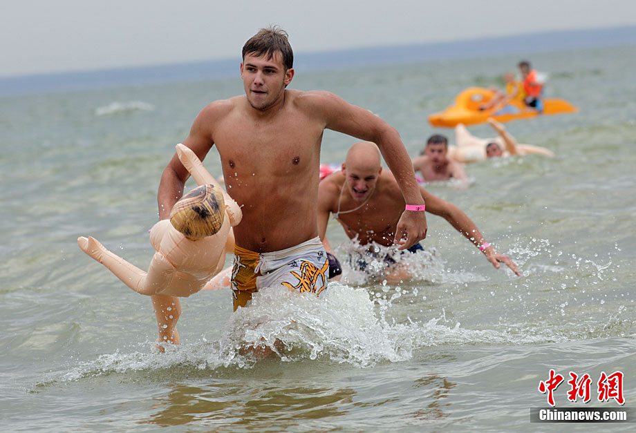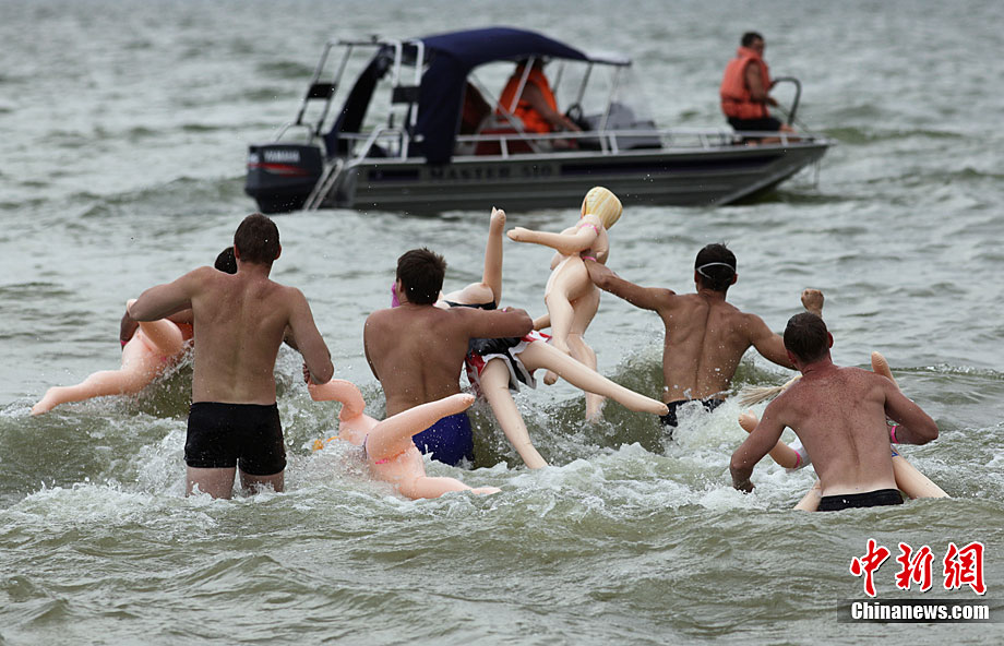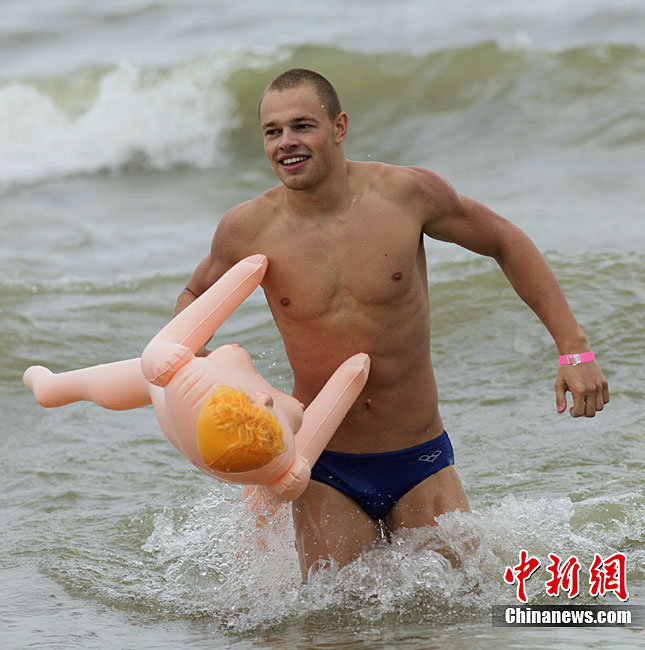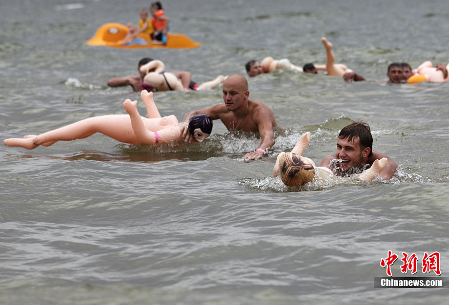 俄罗斯搞笑游泳比赛 怀抱“充气娃娃”游泳