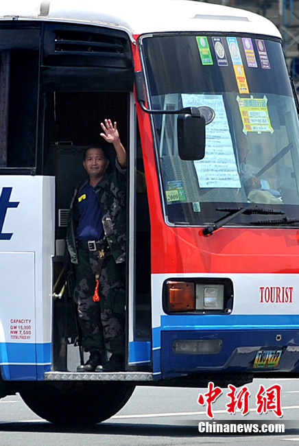 香港康泰旅行社23日证实,一个21人的香港旅行团在菲律宾马尼拉被劫持。旅行团包括20名香港游客和1名香港领队,其中有3名儿童。劫持者是一位被革职的警察。截止目前已有6名人质获释,其中包括3名儿童。图为劫持者站在被劫持的旅游观光车门口。