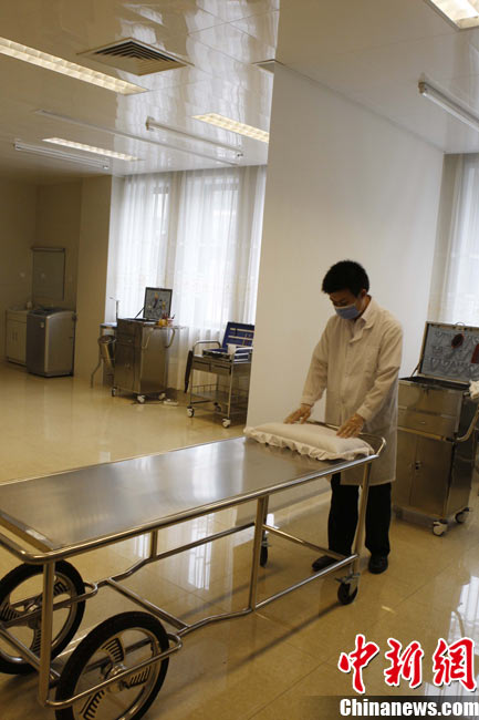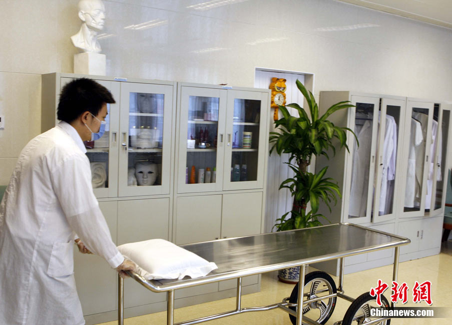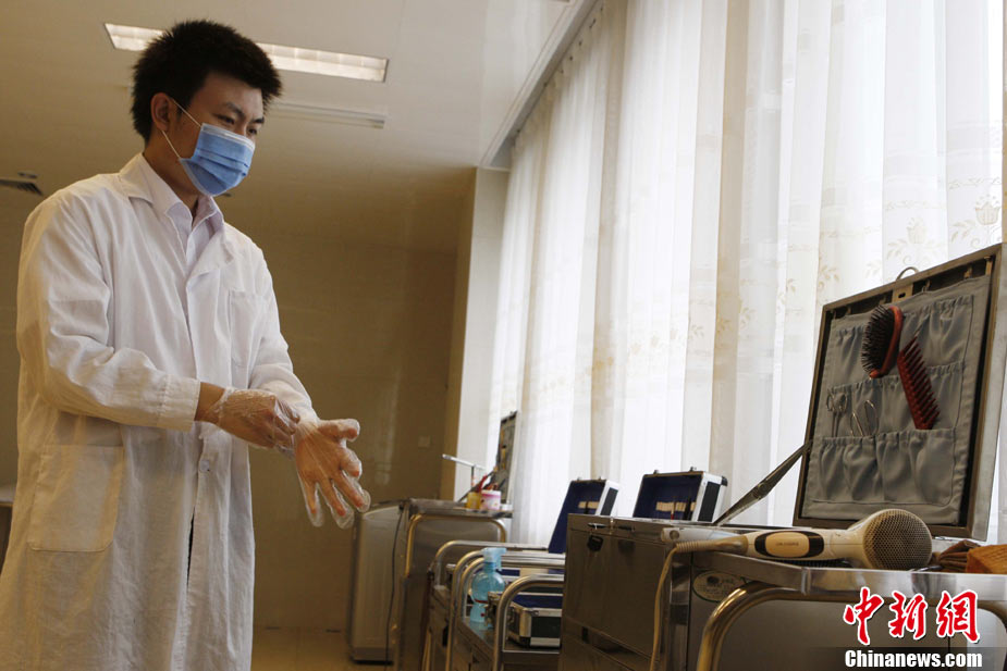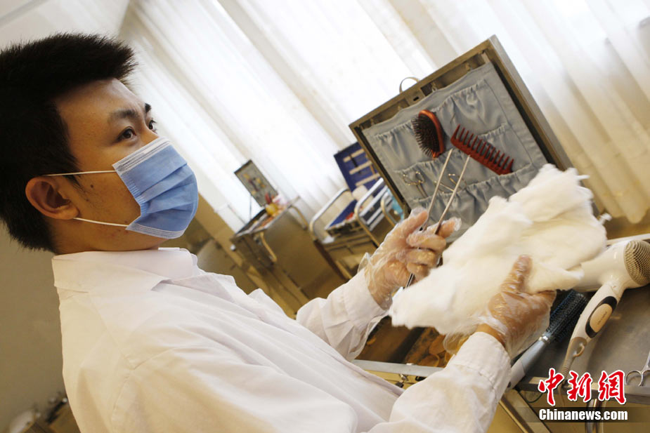 近期,北京团市委正在开展“探访青年劳动者”活动。二十八岁的八宝山殡仪馆整容师张洋便是其中之一。他自二〇〇五年进入八宝山殡仪馆工作以来,勤学苦练,刻苦钻研,勇于创新,共为三千余位逝者提供了高质量的整容服务,圆满完成了二零一零年八名驻海地维和人员不幸遇难后遗体整容工作等二十余次重大任务。在刚刚结束的全国民政行业职业技能竞赛中夺得大赛一等奖第一名。中新社记者 任海霞 摄