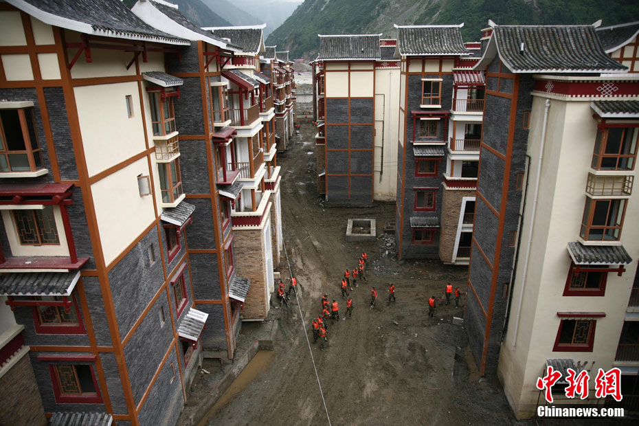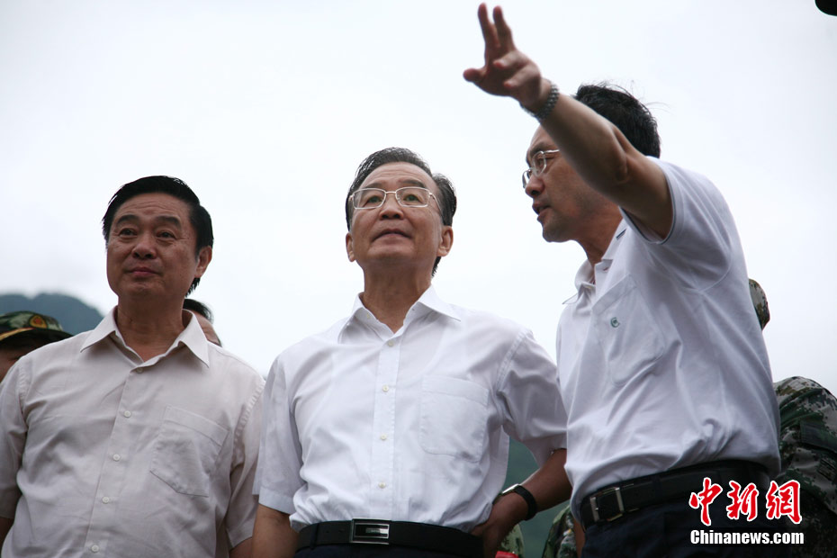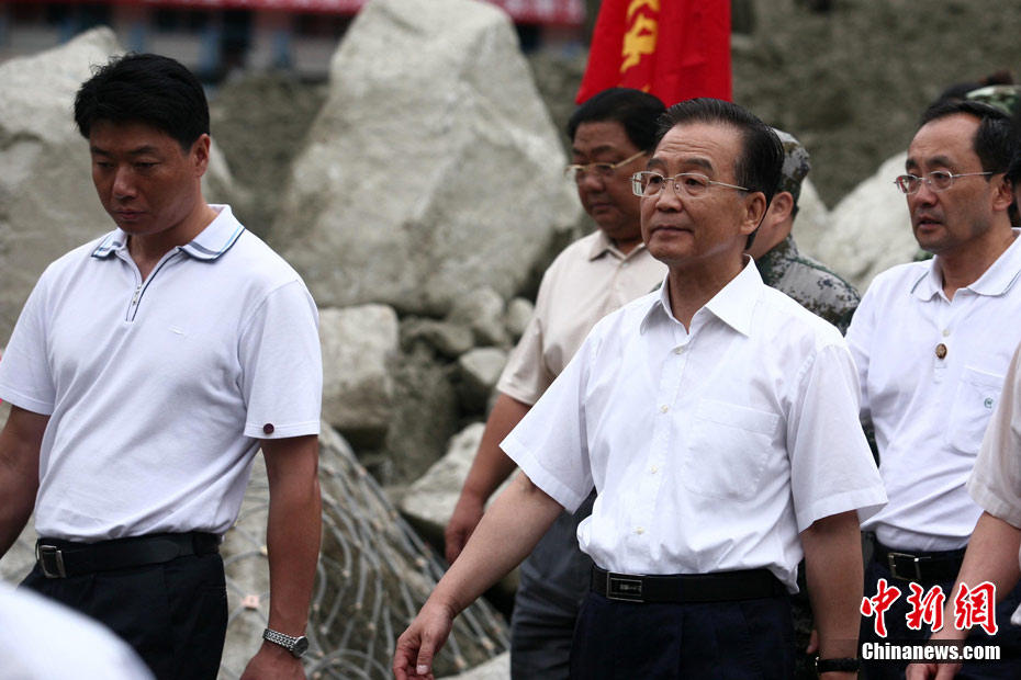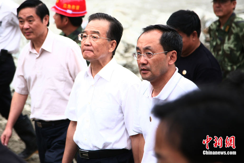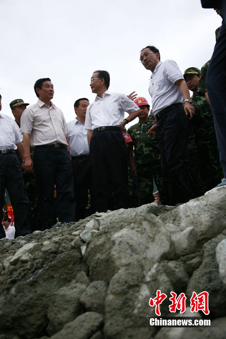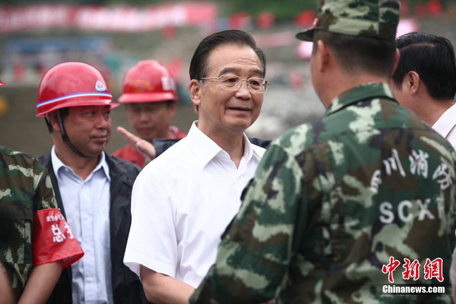 8月23日下午,中国国务院总理温家宝抵达四川汶川泥石流重灾区映秀镇指导抢险工作,并慰问了参加此次抢险的武警官兵。温家宝总理于22日中午临时决定,改变从舟曲返京日程,直飞四川绵阳,指导当地抗洪救灾工作。图为温家宝在映秀镇泥石流现场慰问四川消防官兵。中新社发 张浪 摄