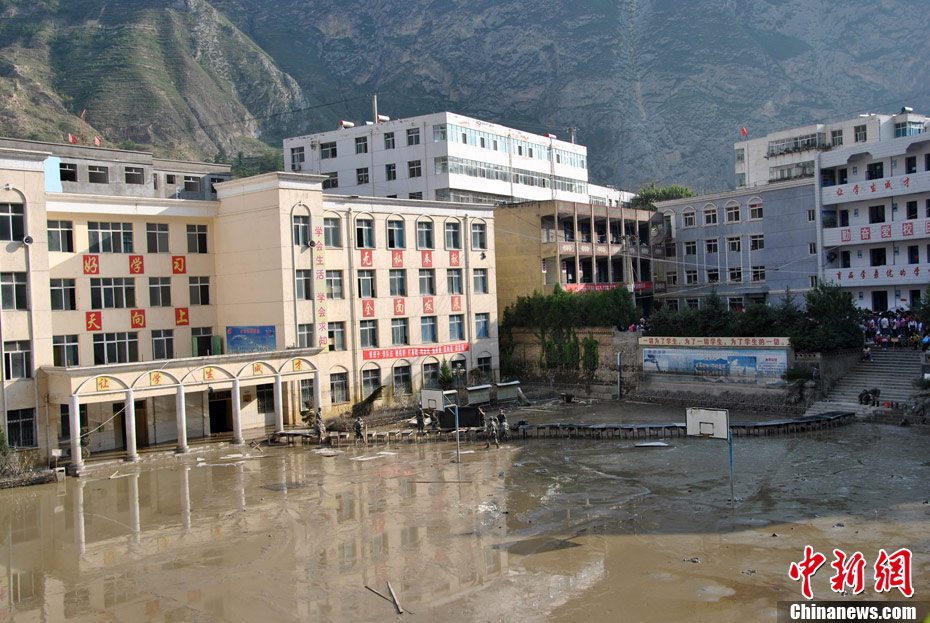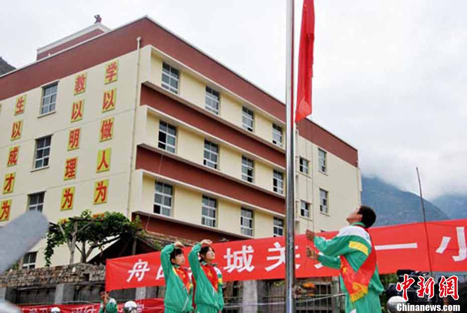 8月25日,舟曲小学生迎来新学期的第一天。图为当日上午城关一小举行升国旗仪式。马晓俊 摄