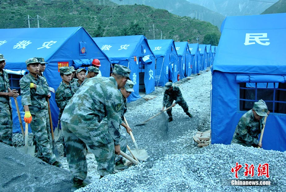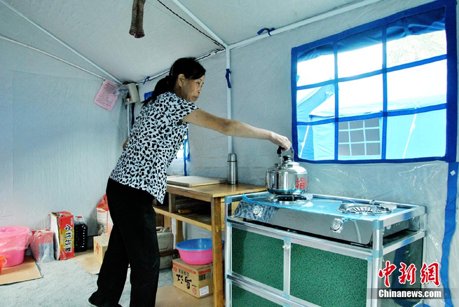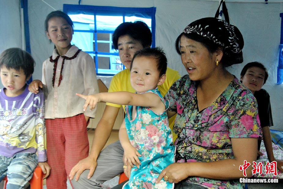 8月25日,舟曲泥石流灾区对受灾民众进行二次安置,将部分无家可归的民众安置到新搭建的沙川坝“帐篷社区”。图为奶奶愉快的对小孙子说:“咱们搬进新家了”。 中新社发 马晓俊 摄