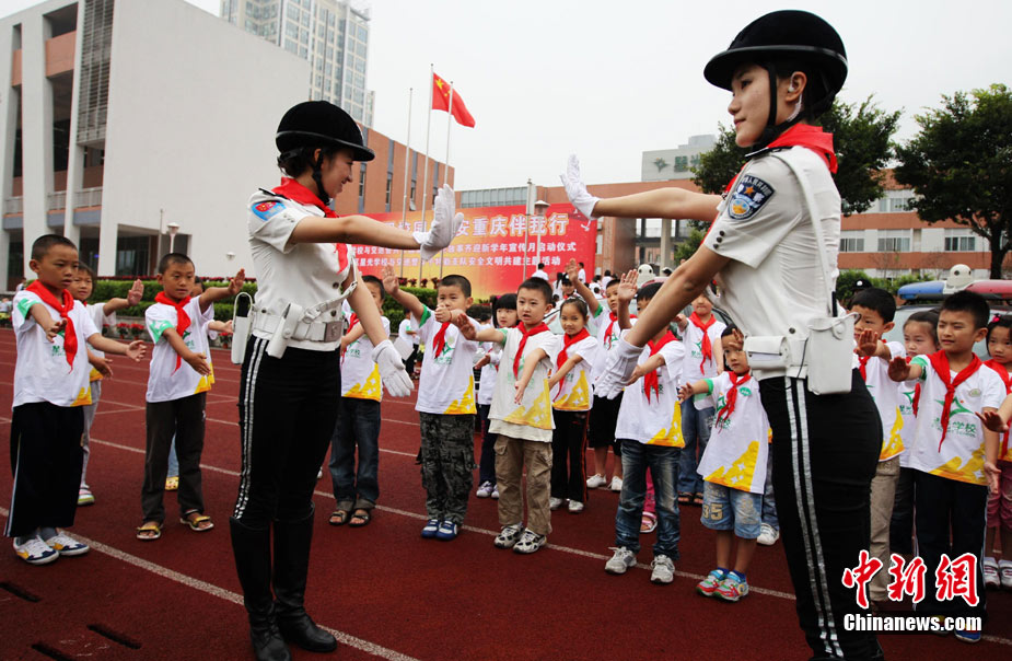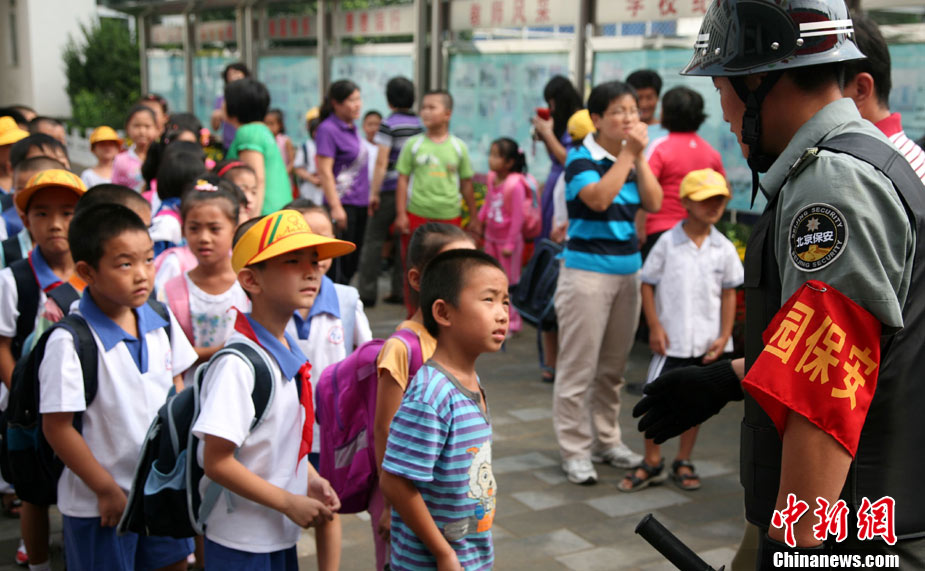 快乐的暑假结束了,全国中小学生陆续开学上课,迎来了新学期。图为8月30日,山东博山考院小学门前,一年级的子琰小朋友在学校警戒线外与家长再见。中新社发 刘震 摄