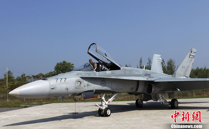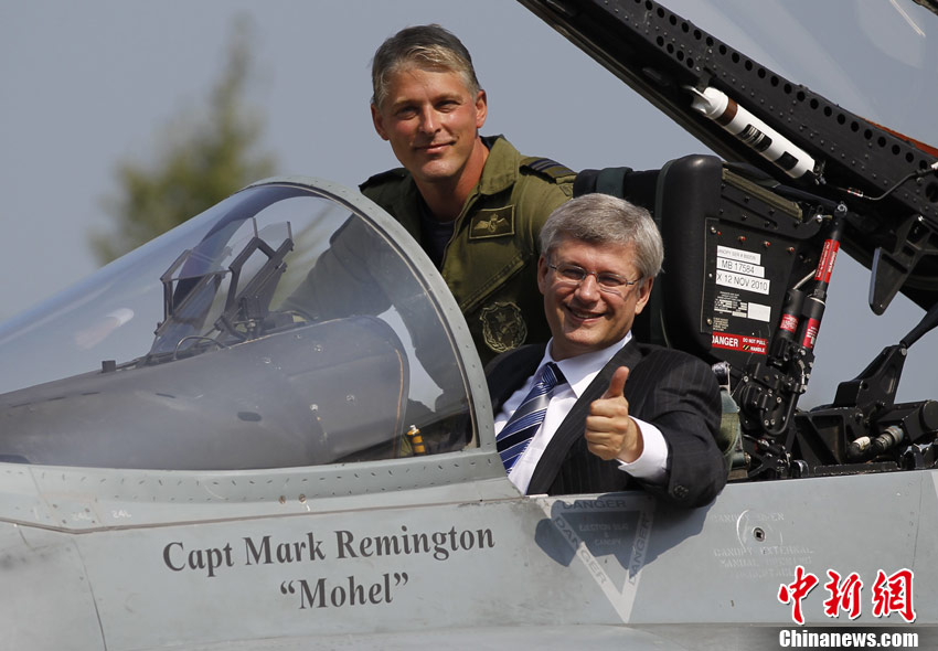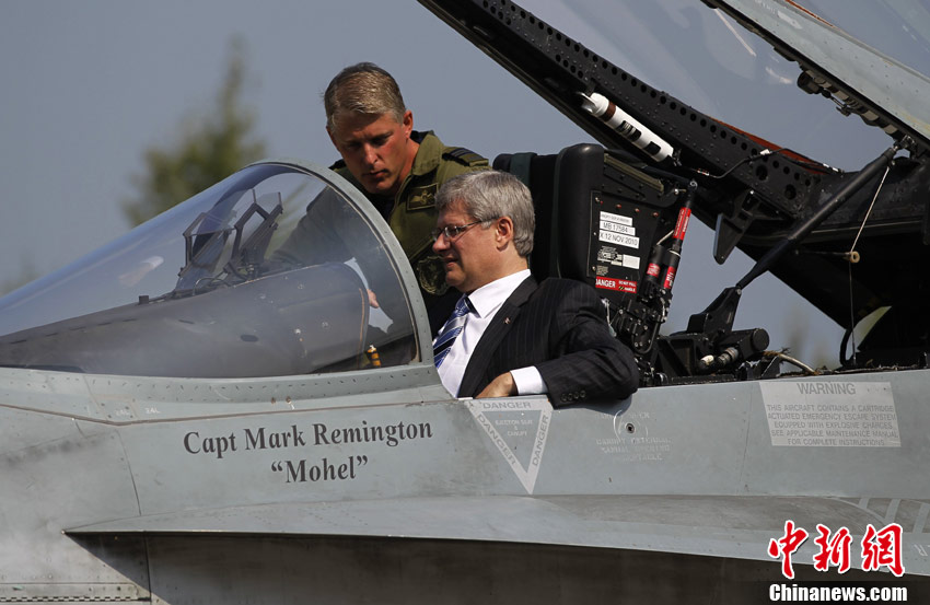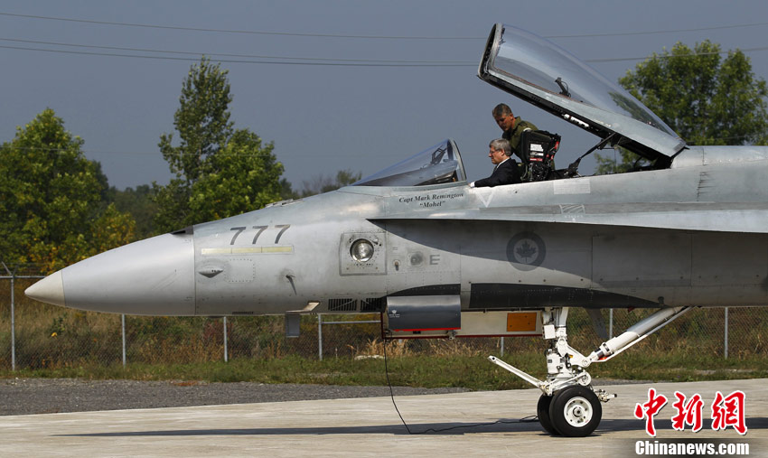 当地时间9月1日,加拿大米拉贝尔,加拿大总理哈珀参观L-3通信公司,并坐进一架CF-18“大黄蜂”战斗机驾驶舱进行体验。