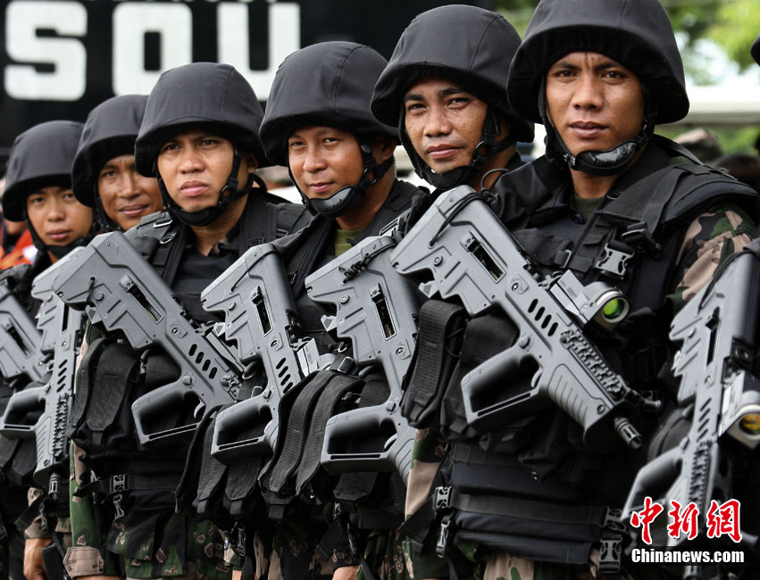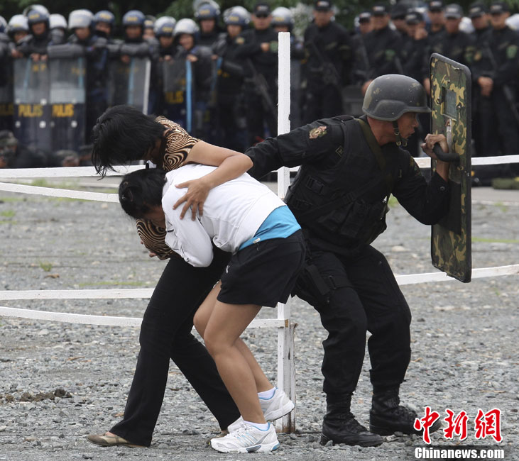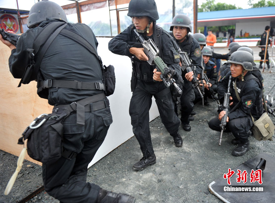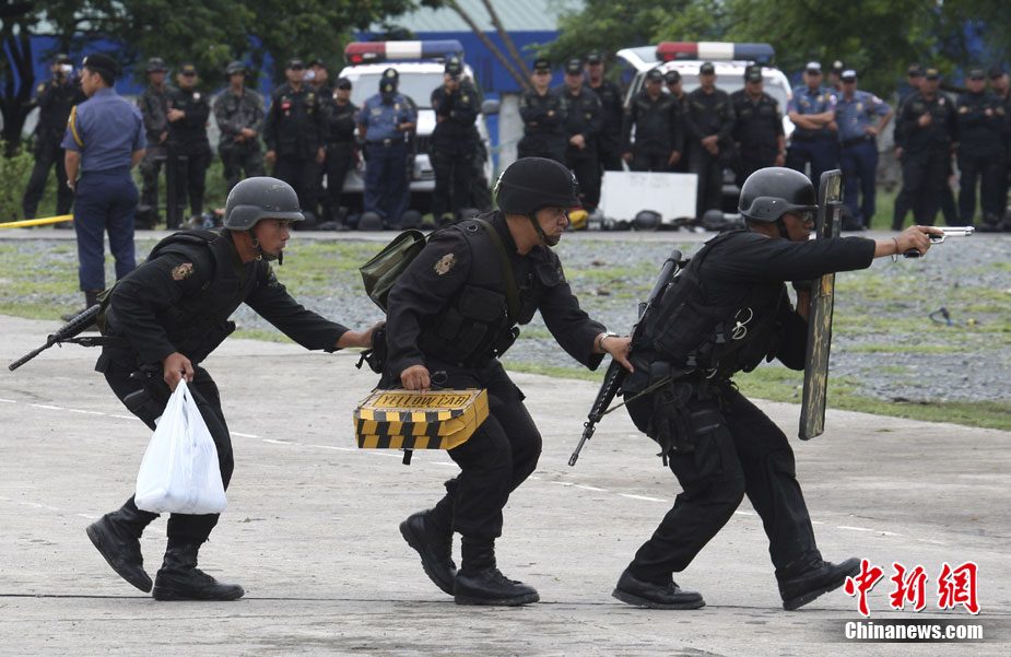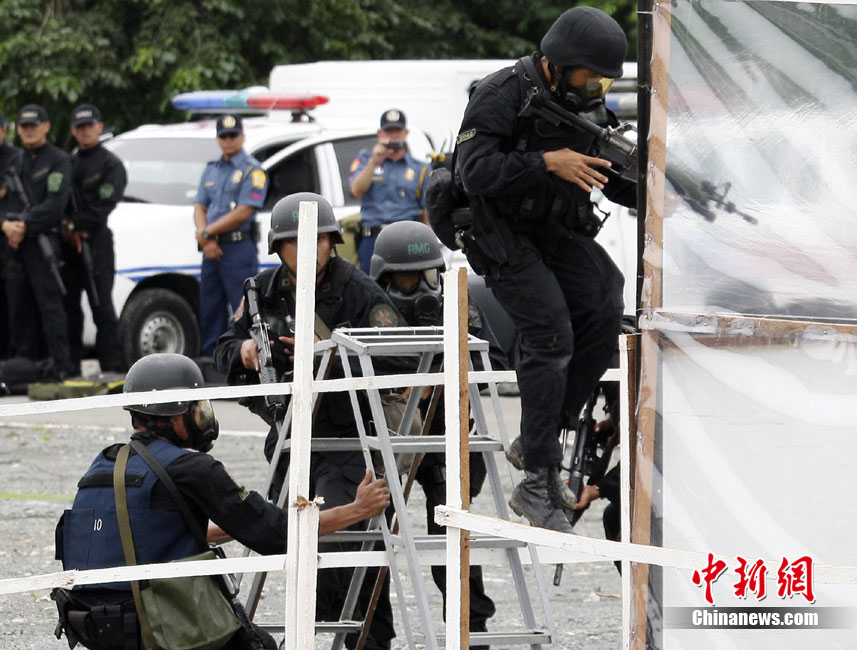 9月3日,菲律宾警察在首都司令部驻地内举行解救人质演习。
