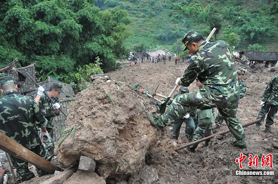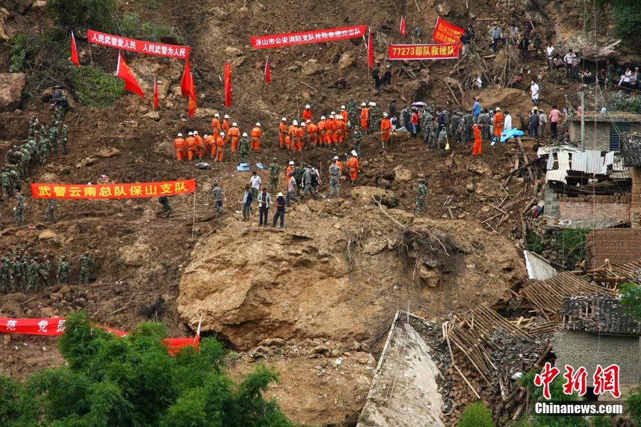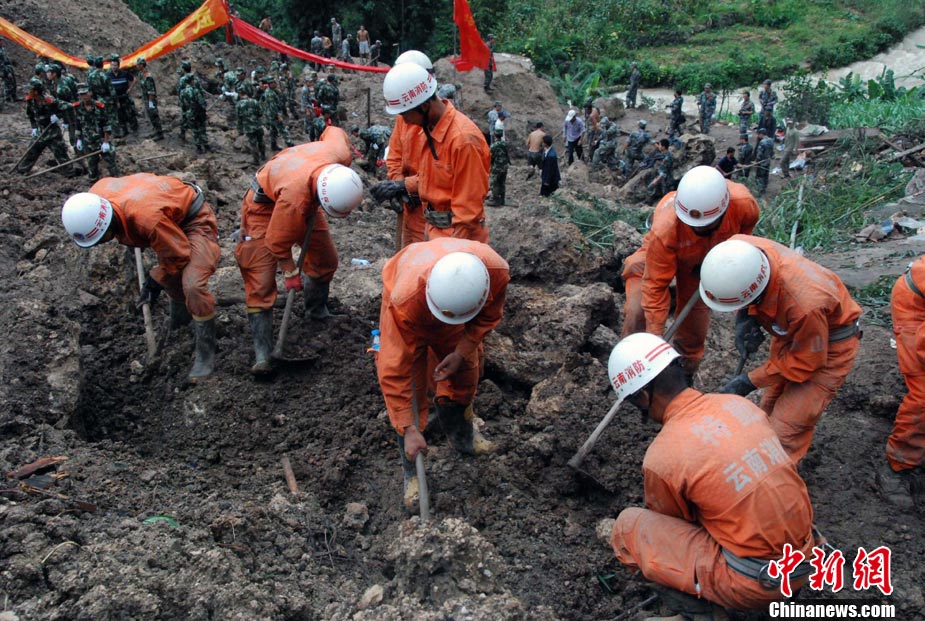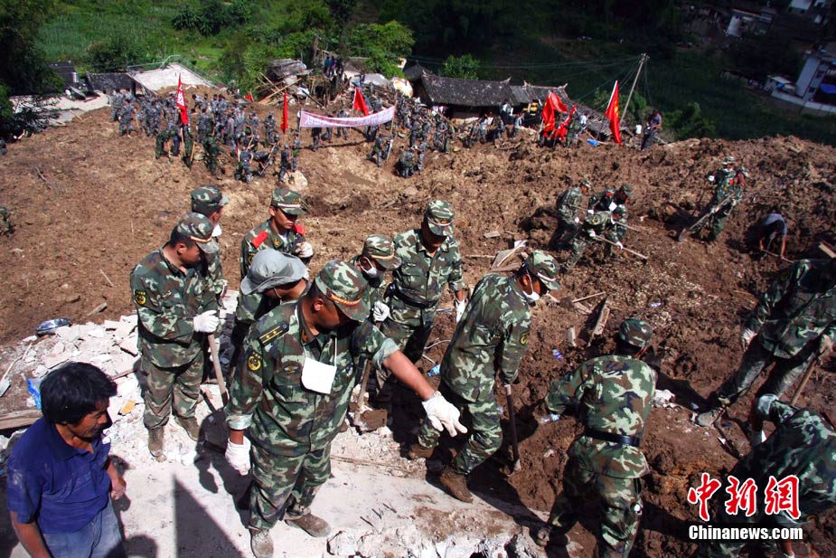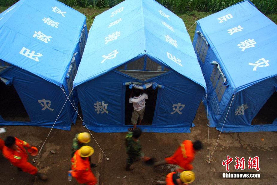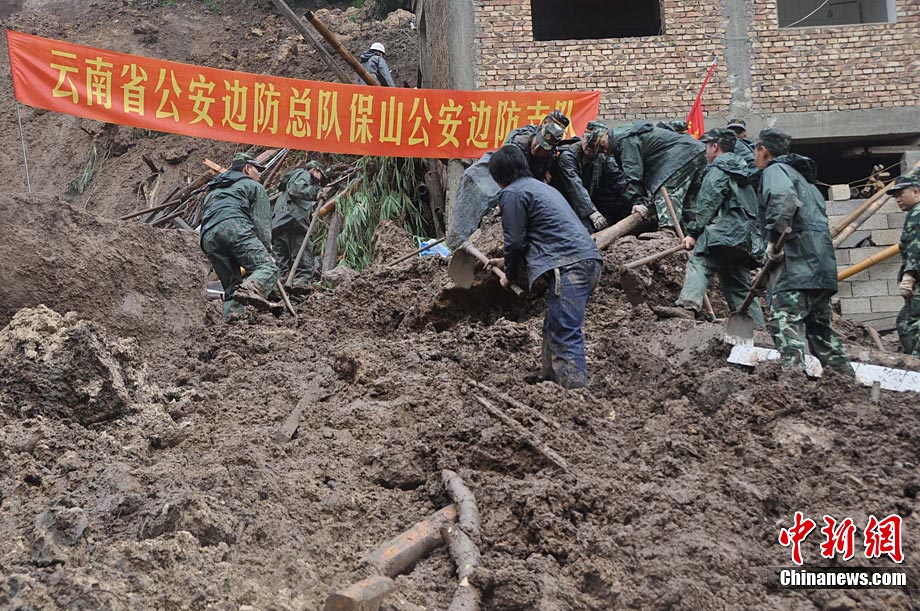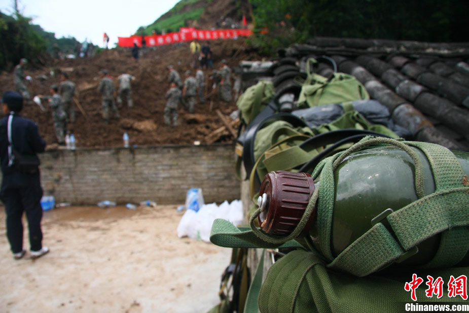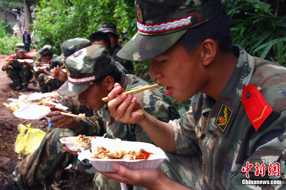 截止2010年9月3日上午8时,云南省保山隆阳区瓦马乡河东村大石房村民小组的特大地质灾害已致15人死亡,33人失踪。据参与救援的武警某中队中队长介绍,他们中队参加救援的150多人当中80%都是“90”后,最小的只有17岁,并且在两天的救援工作中就搜救出了2名遇难者。图为救援官兵午间休息。中新社发 任东 摄