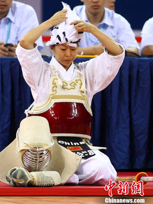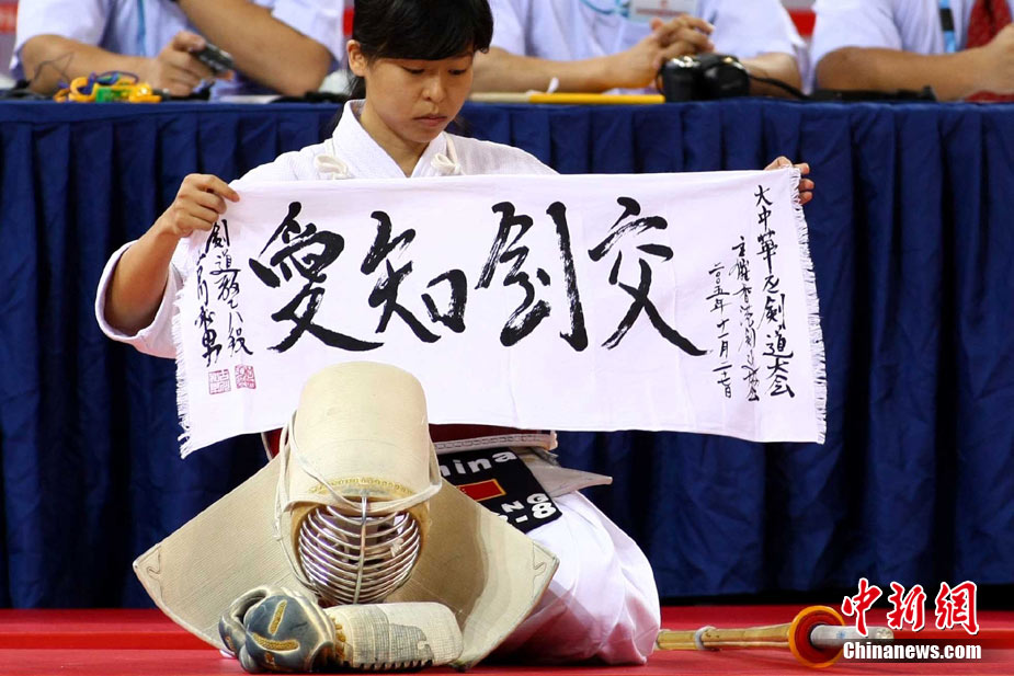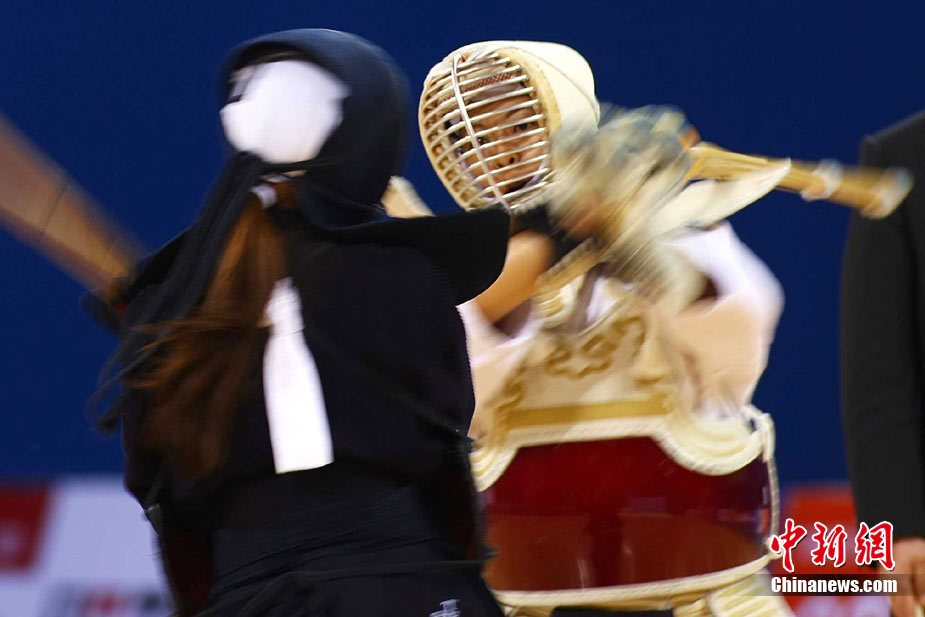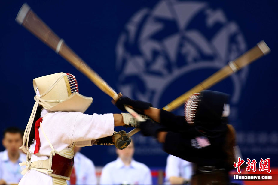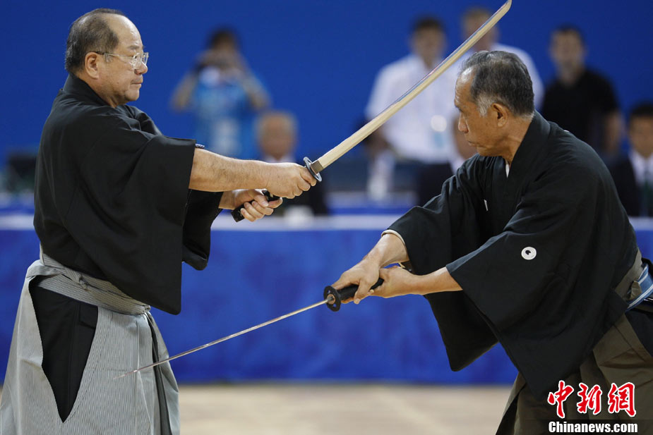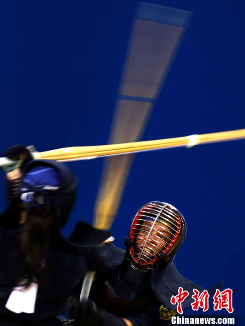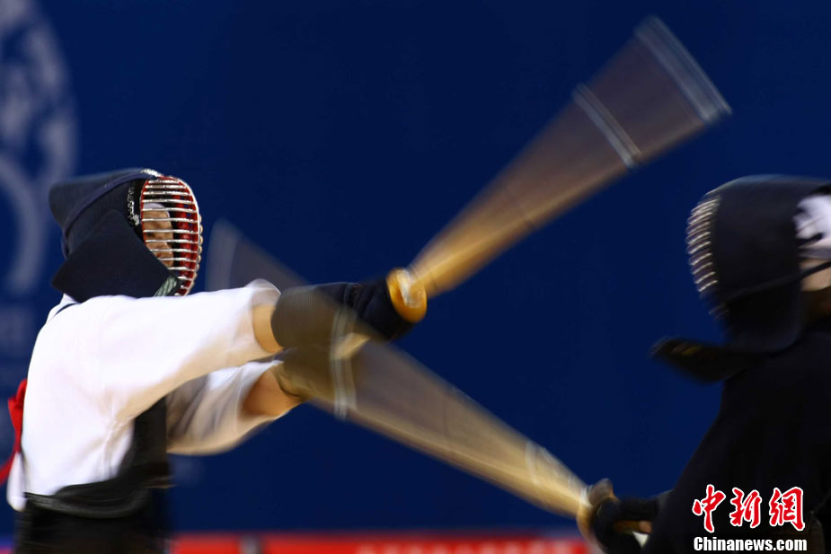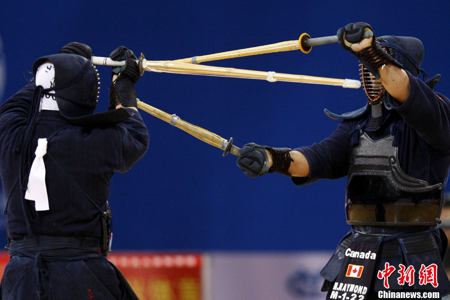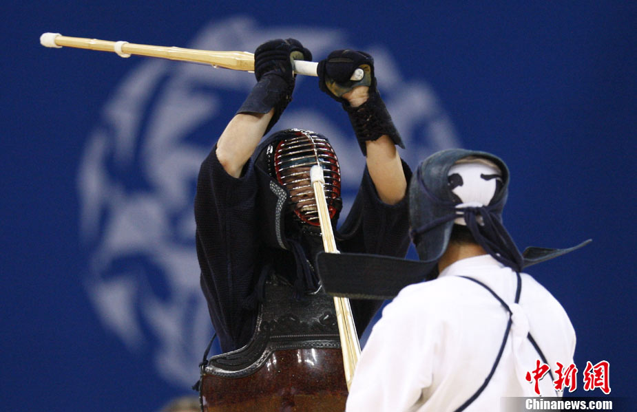 9月3日,2010年北京首届世界武搏运动会剑道比赛在北京科技大学体育馆开赛,当天举行男、女个人赛预赛和决赛及女子特殊邀请赛预赛和决赛。图为在男子个人邀请赛中,日本选手昭司寺本(Shoji TERAMOTO)(右)和巴西选手奥纳卡(Ernesto Eisaku ONAKA)在比赛中。中新社记者 盛佳鹏 摄