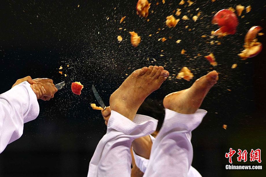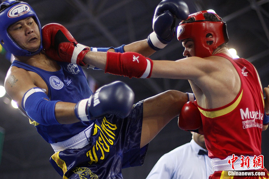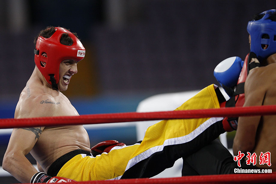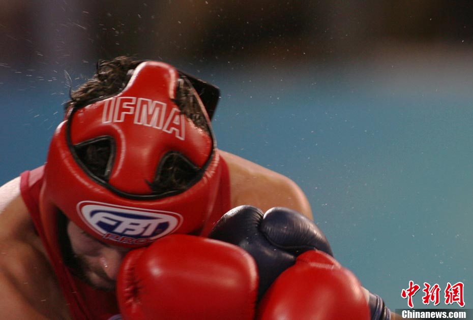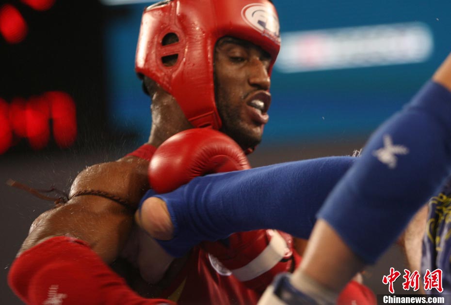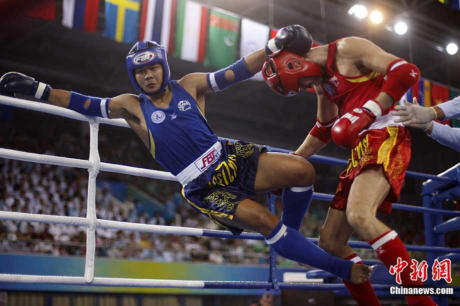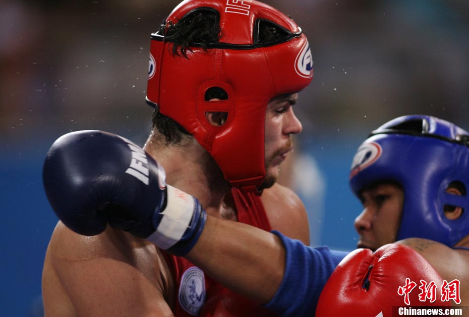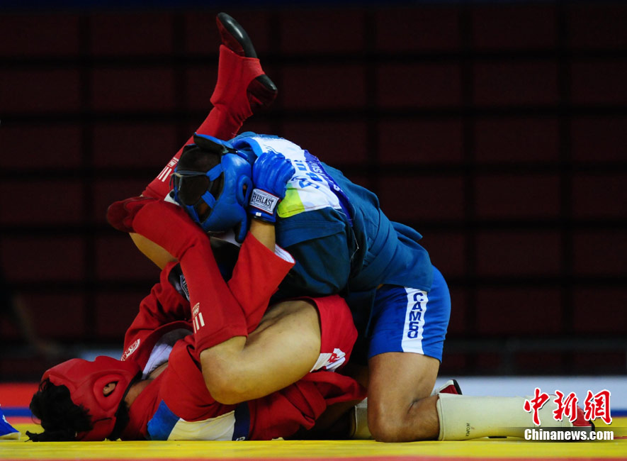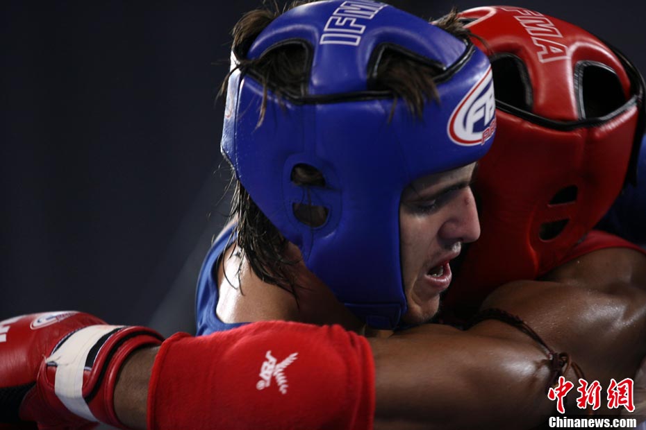 9月3日,2010年北京首届世界武搏运动会剑道比赛在北京科技大学体育馆开赛,当天举行男、女个人赛预赛和决赛及女子特殊邀请赛预赛和决赛。图为在男子个人邀请赛中,日本选手昭司寺本(Shoji TERAMOTO)(右)和巴西选手奥纳卡(Ernesto Eisaku ONAKA)在比赛中。中新社记者 盛佳鹏 摄