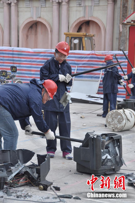 9月4日,一群全副武装、手持铁锤的都市人在长沙世界之窗内广场上疯狂锤砸废旧小铁屋,以此宣泄心中的压力。据悉,为帮助都市人群释放因工作、生活带来的压力和郁闷,长沙世界之窗从当日开始举行为期一个月的减压节。主办方将收集来的摩托车、小车、电视机、洗衣机等废旧设备摆放在预设的场地内,每天召集数十名游客参与其中。 中新社记者 肖前辉 摄