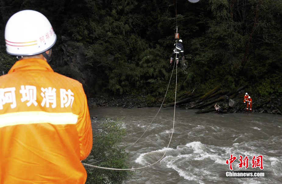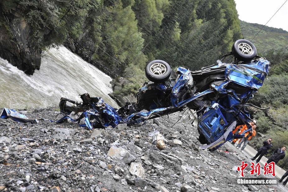 9月5日,四川马尔康梭磨乡发生一起车祸,导致两辆车坠入河中,目前,其中的一辆面包车已被打捞上岸,车内有3人丧生,另一辆皮卡车还在搜寻之中,事故原因正在进一步调查中。图为面包车被打捞上岸。中新社发 沈消轩 摄