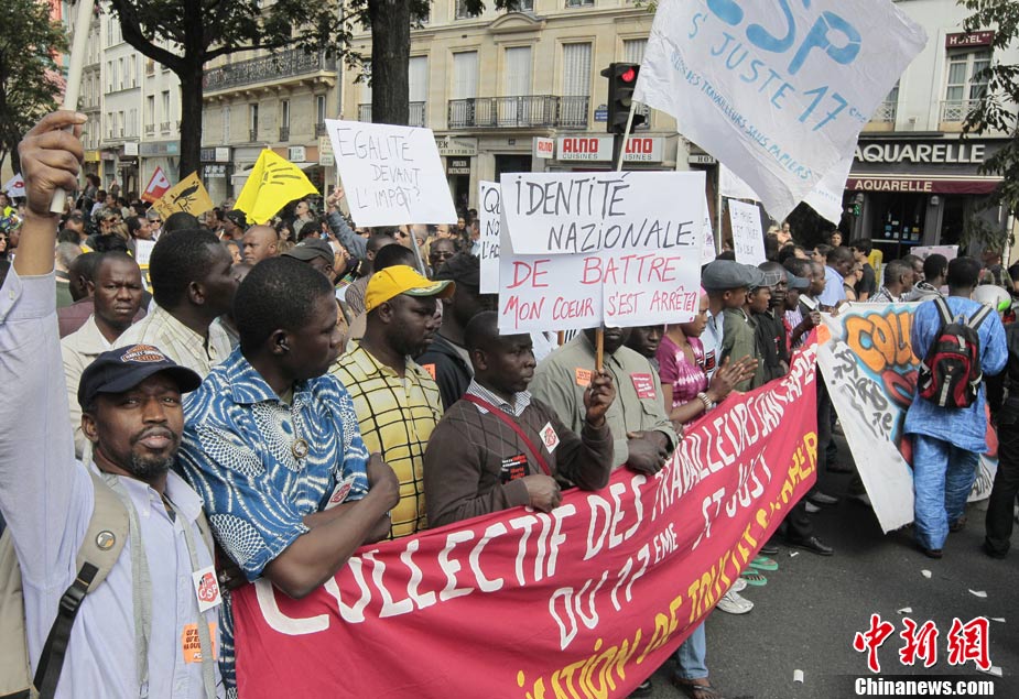 法国全国各地4日有数以万计的群众上街示威,抗议政府最近采取新政策,强行驱逐吉卜赛人出境。欧洲其它城市包括贝尔格莱德和罗马,也有群众游行声援吉卜赛人。图为在法国南特,民众示威抗议政府强行驱逐吉普赛人。