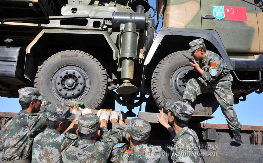 顾不上长途奔波和路途劳累的参演官兵,到达换装点后就立即开始了换乘换装。经过近6小时的卸载、装载,中方参演部队的装备车辆全部驶上了哈方军列,并在铁路专业装卸队的协助下,对20吨以上轮式装备按照哈方的要求进行捆绑加固。