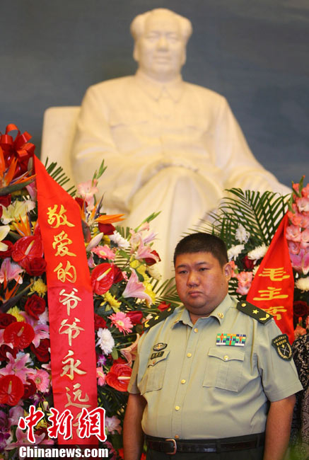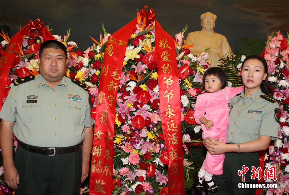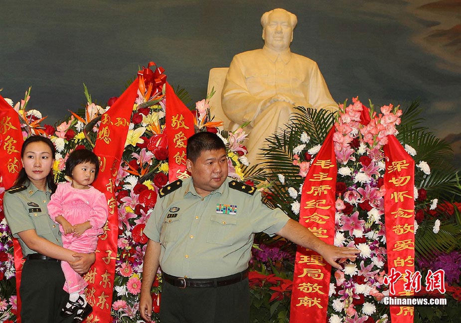 9月9日是毛泽东逝世34周年纪念日。当日上午,毛泽东的孙子、刚刚晋升为解放军少将的毛新宇与夫人刘滨,带着两岁的女儿毛甜懿到位于北京天安门广场的毛主席纪念堂敬献鲜花。中新社记者 任晨鸣 摄