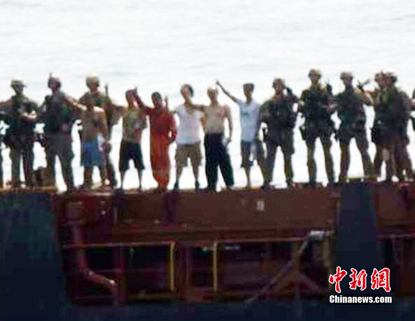 美国海军陆战队官兵9日成功从索马里海盗手中夺回了一天前遭劫持的德国货轮。美方称,在整个解救过程中,美军未放一枪一弹,9名海盗束手就擒,11名船员安然无恙。