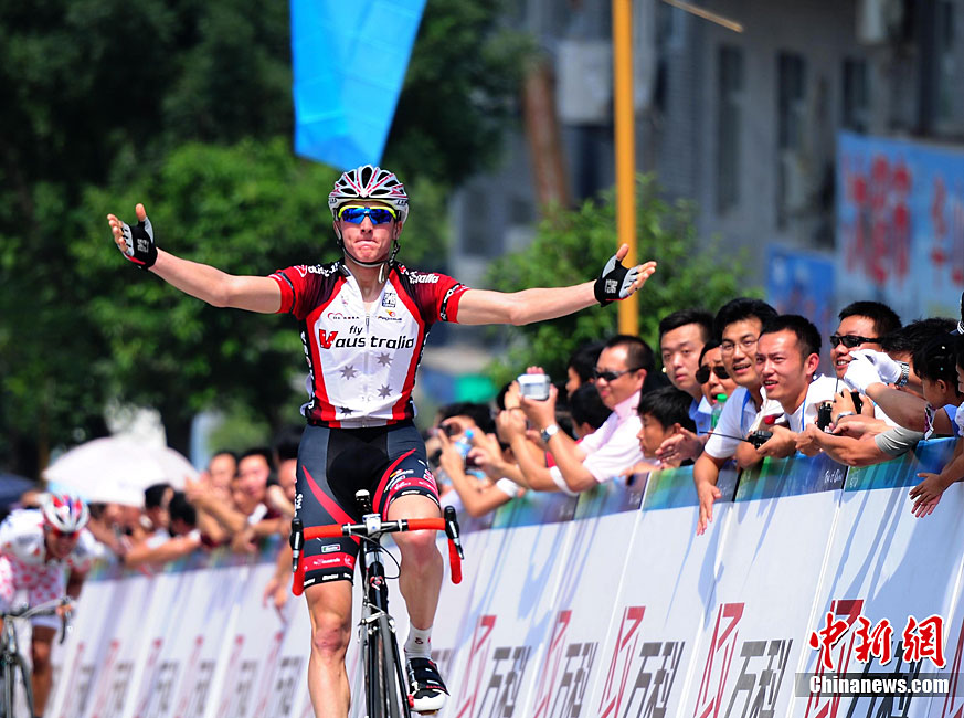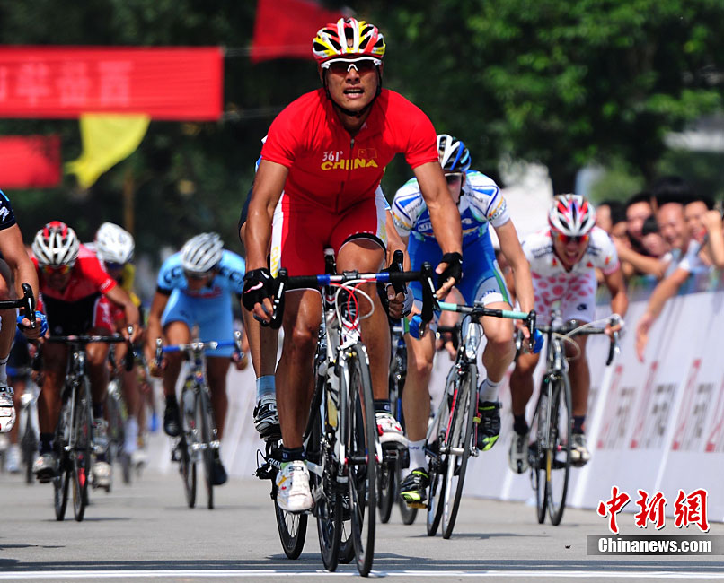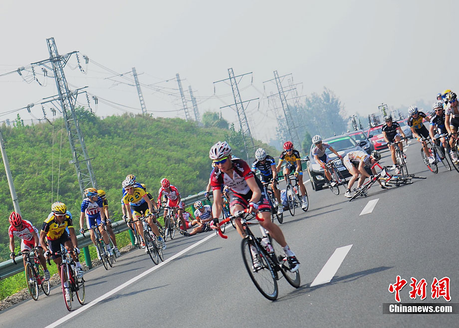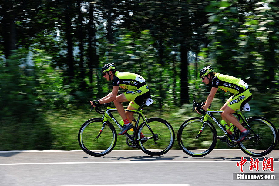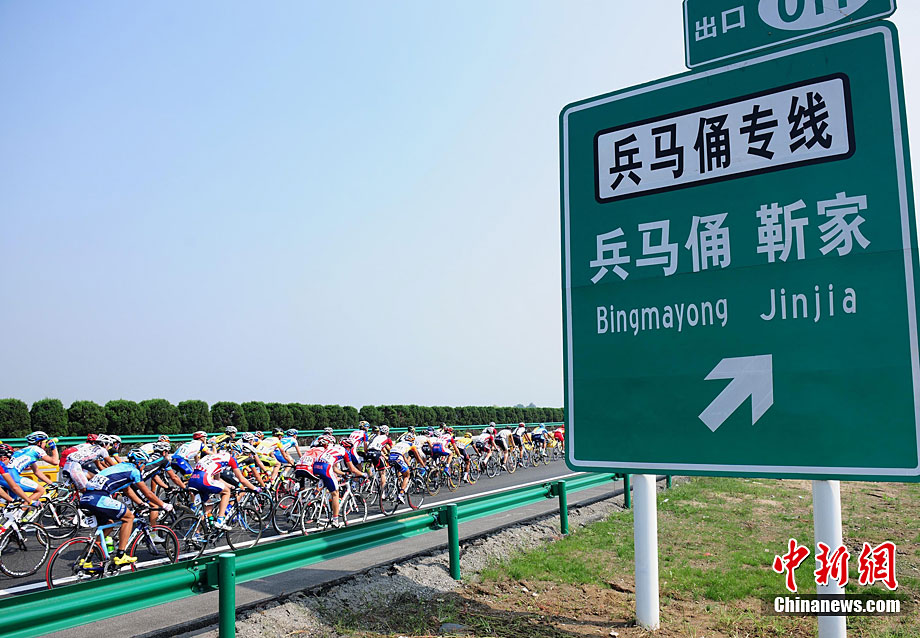 9月12日上午,首届环中国国际公路自行车赛进入第二赛段,由西安前往华山,全程118公里。图为德国纽特里什车队的一些选手们在高速公路上飞速前进。中新社记者 侯宇 摄