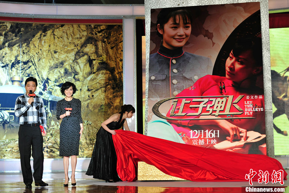 9月16日,将于12月26日震撼上映的电影《让子弹飞》导演姜文携主演刘嘉玲、廖凡、邵兵亮相北京,为即将上映的新作站台宣传。当回答“票房预期”时,姜文自信的表示“我们这个戏里有葛优,有周润发,以前别人说一个电影‘不优不发’或者说‘不发不优’。那我们这个片子里又有(葛)优又有(周润)发,我都不敢想能卖多少了。” 女主角刘嘉玲在片中“情挑”姜文、周润发、葛优三影帝。她更是对《让子弹飞》成为今年内地票房冠军充满信心,表示假如梁朝伟《一代宗师》赶上贺岁档,乐意打败他们。
