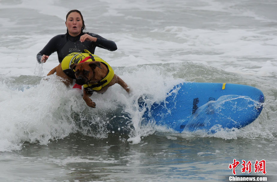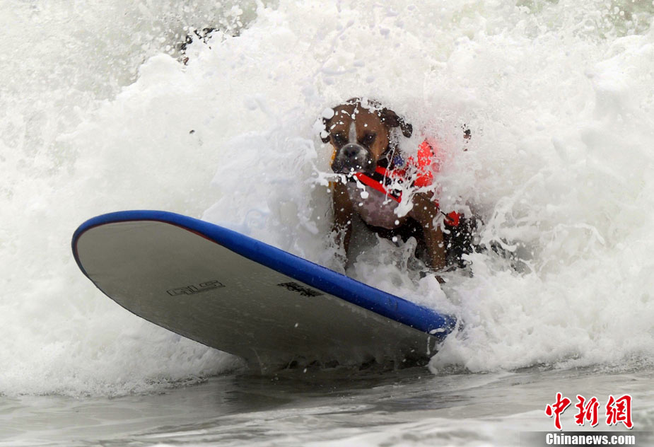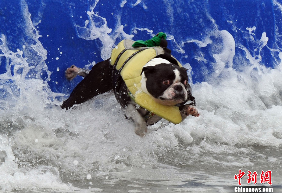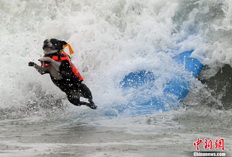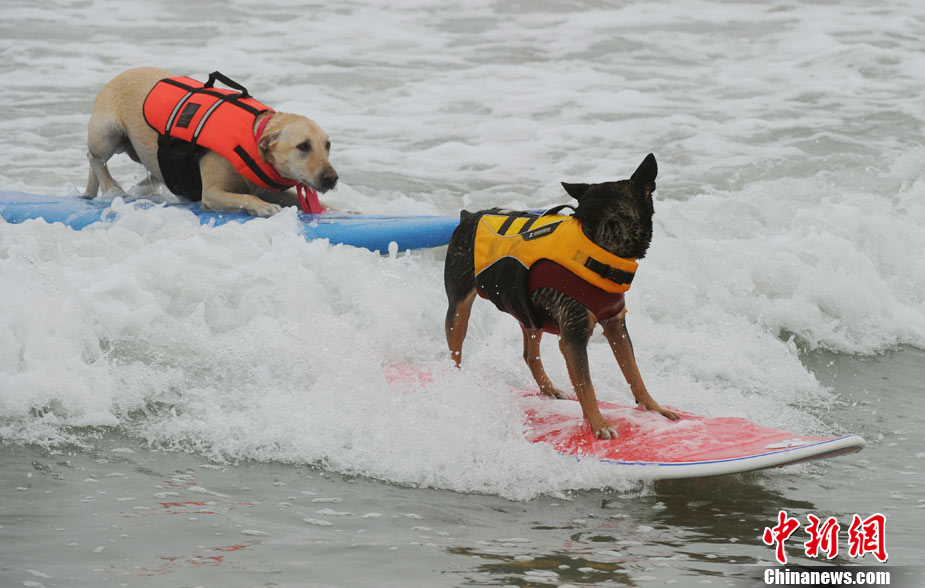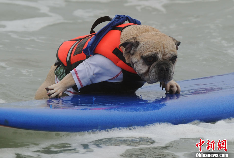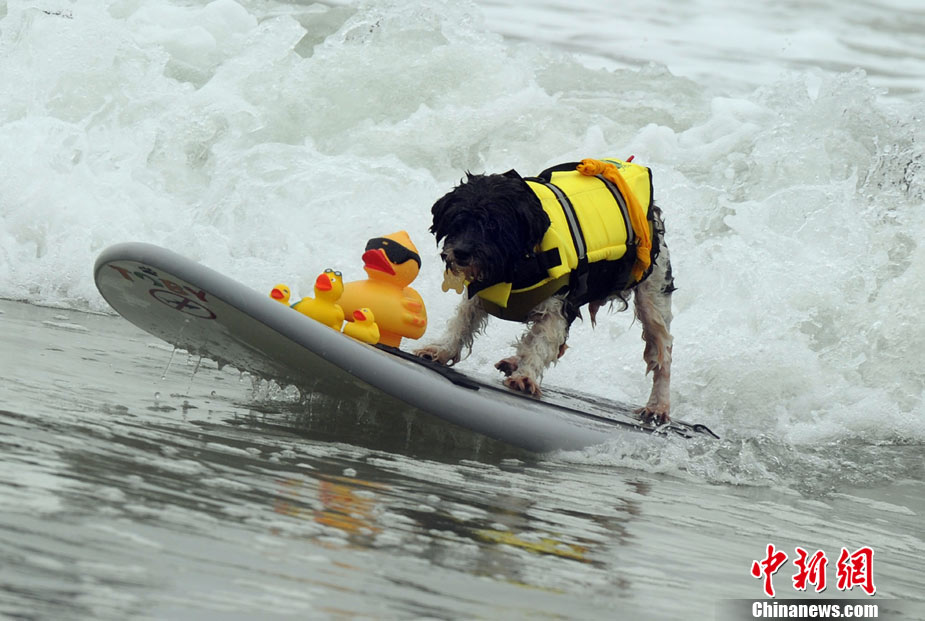 9月19日,在美国加利福尼亚州的亨廷顿比奇,可爱的狗狗们举行了一场别开生面的冲浪大赛。