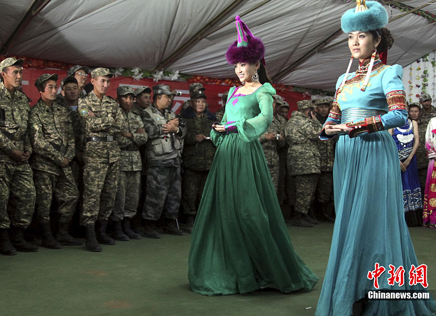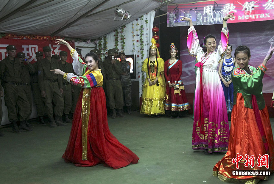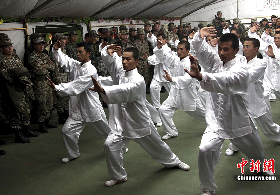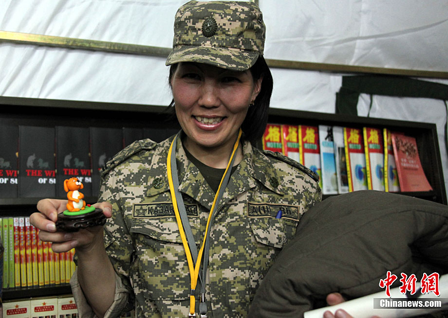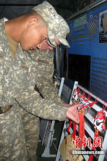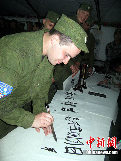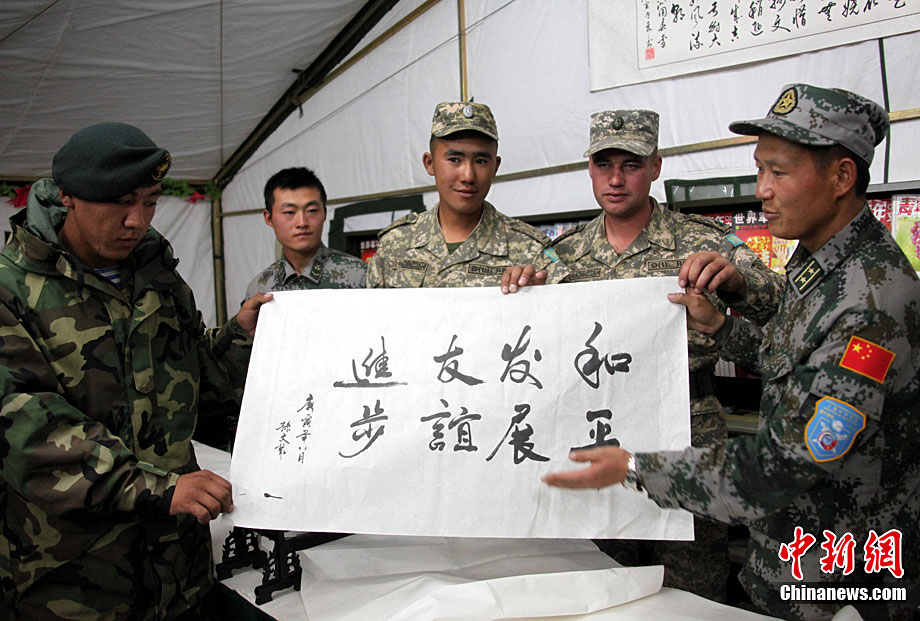 9月20日是“和平使命-2010”联演确定的中国民族文化日,当地时间黄昏时分至晚上,哈萨克斯坦、俄罗斯、塔吉克斯坦、吉尔吉斯斯坦参演部队官兵应邀先后来到中方野战兵营内的“民族文化屋”帐蓬,观赏、体验博大精深的中国文化。图为中方参演官兵现场挥毫并将书法作品赠送给哈方官兵。中新社记者 孙自法 摄