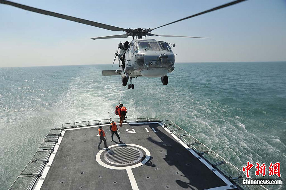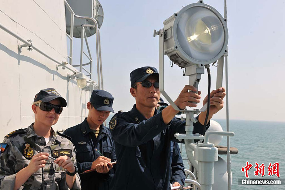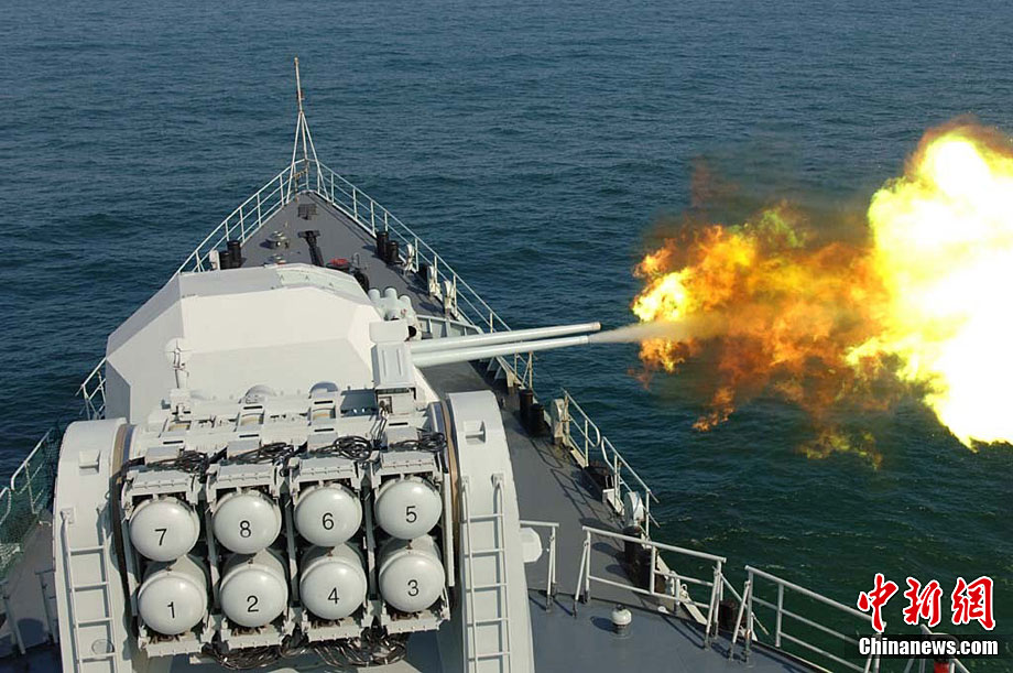 9月23日,中澳两国海军在中国黄海海域举行联合实弹军事演练,此次演练的主要科目有编队通信、海上联合搜救、编队运动、火炮对海射击等内容。图为中国军舰火炮对海上目标实弹射击。中新社发 王松岐 摄