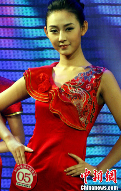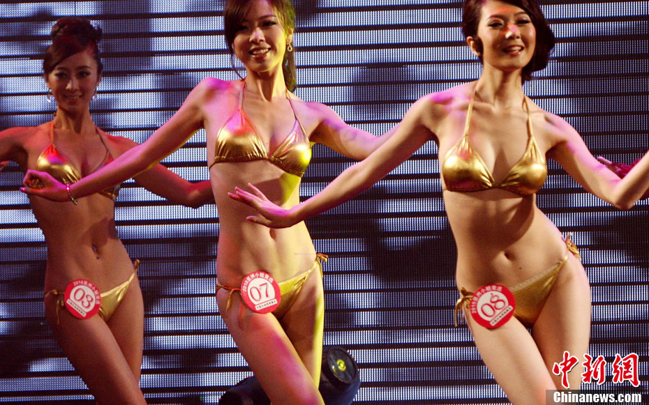 9月24日晚,2010亚洲小姐竞选中国内地网络赛区总决赛在北京举行,15位佳丽“火辣、性感”登场角逐,经过泳装、云锦晚装秀、才艺展示以及现场知识问答等环节,最后选自西南网络赛区的5号王欣获得冠军、华北网络赛区3号刘晓智获得亚军、华北网络赛区10号何娅萌获得季军。图为参赛佳丽展示风采. 中新社发 钱兴强 摄