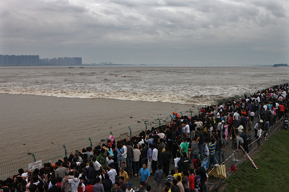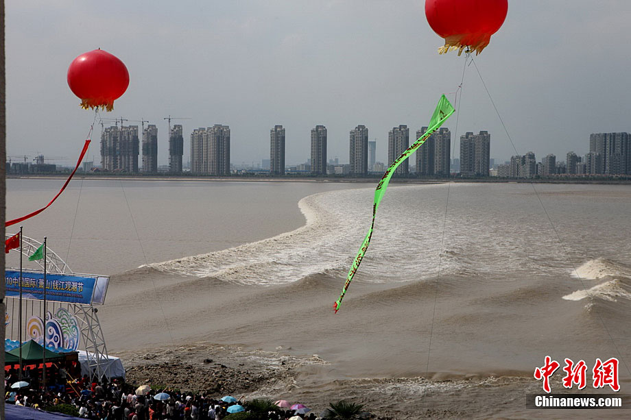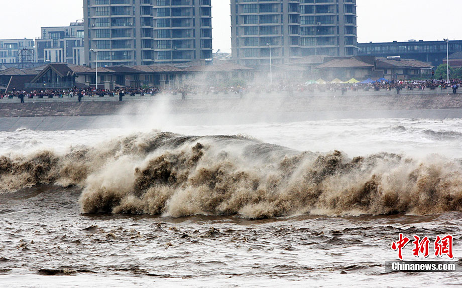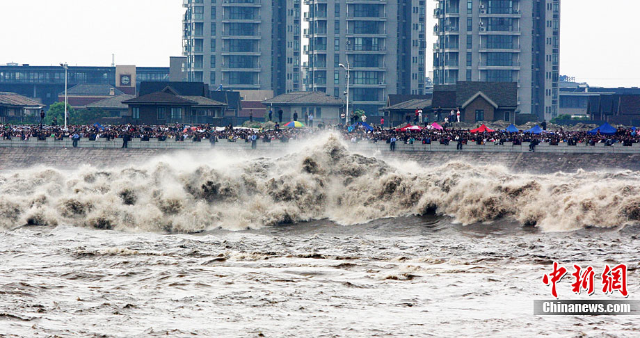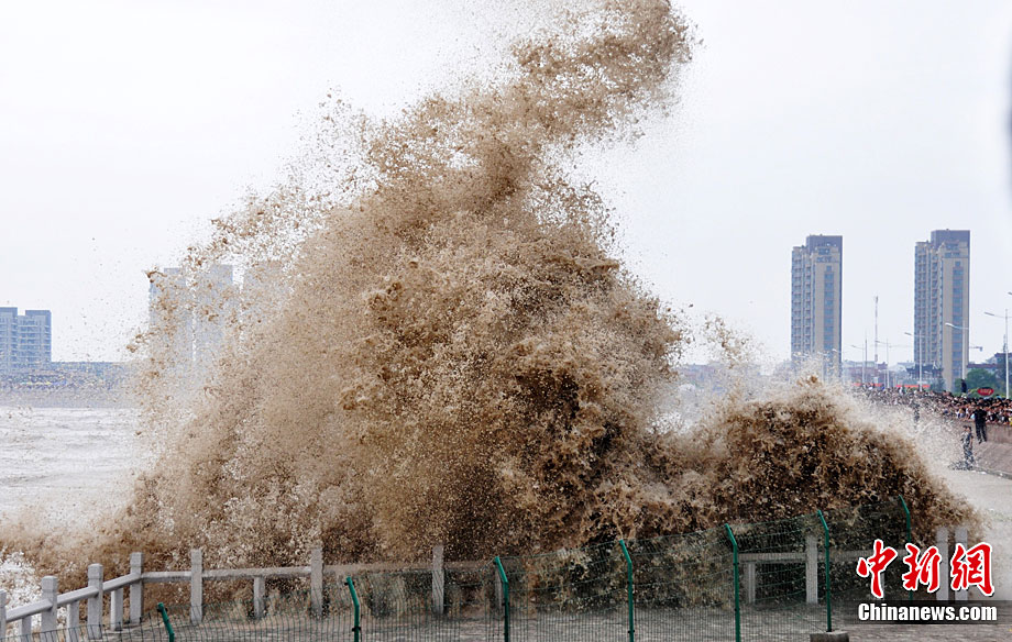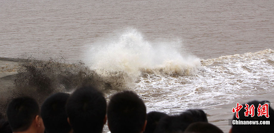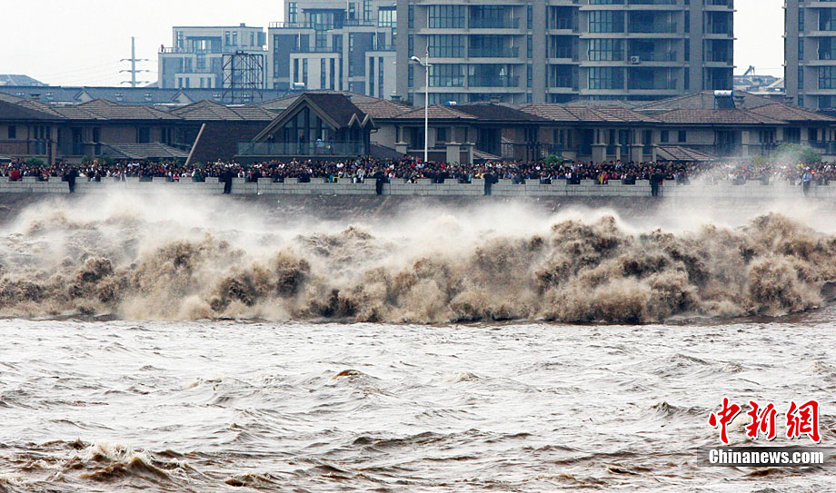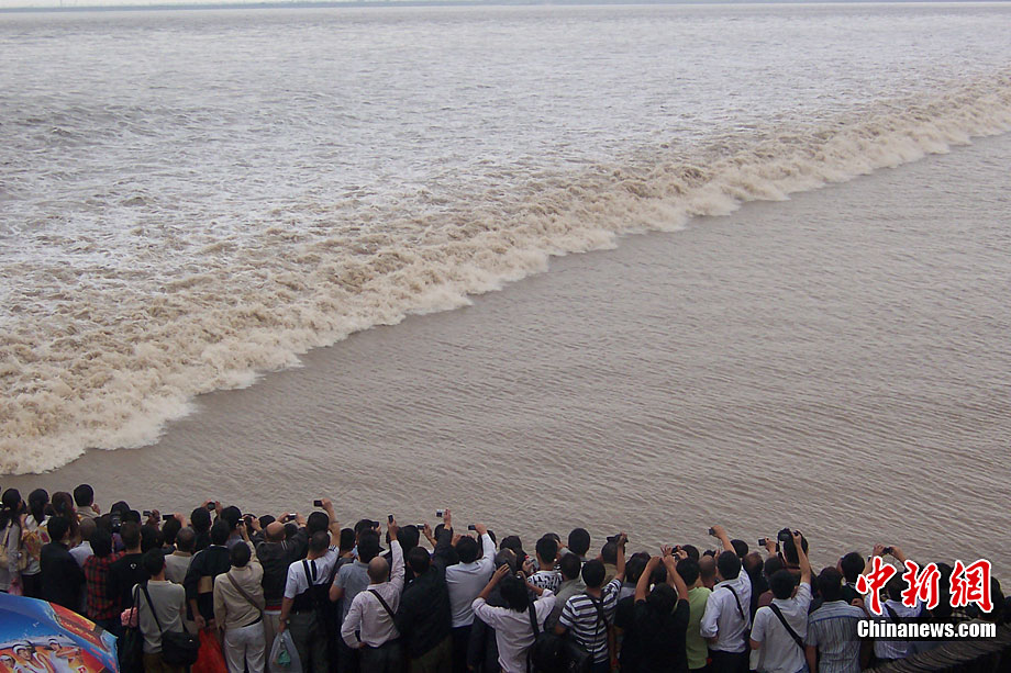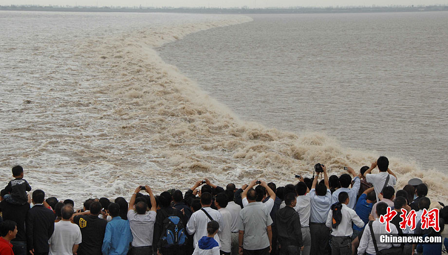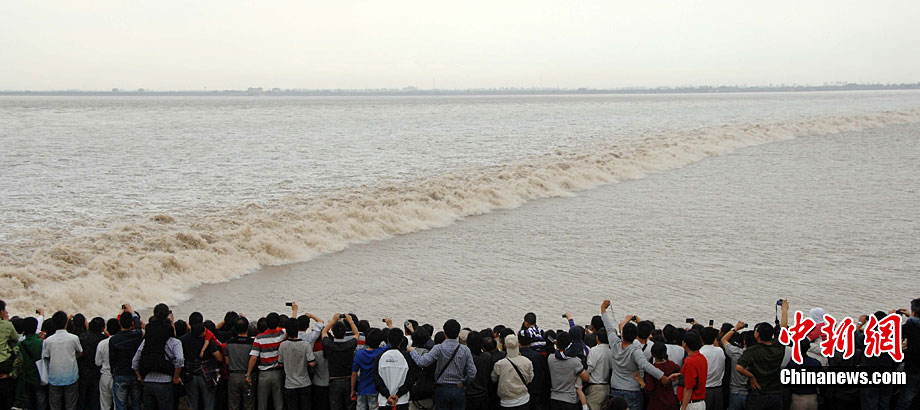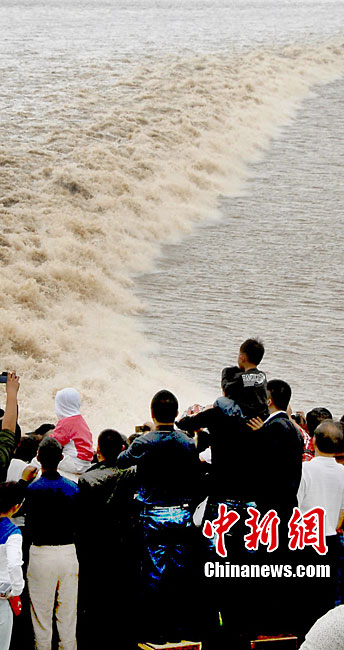 八月十八潮,壮观天下无。9月25日12时38分,近八年最大钱塘潮如约而至抵达浙江省海宁盐官,来自世界各地的游客争睹“一线潮”景观。汪恩民 摄