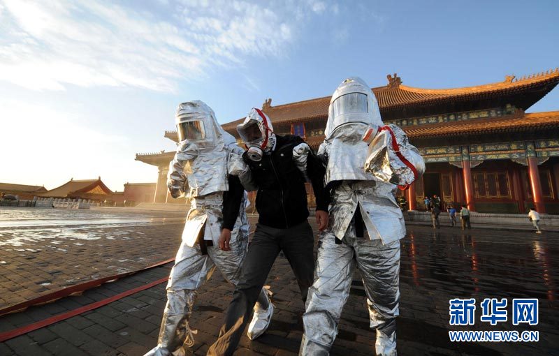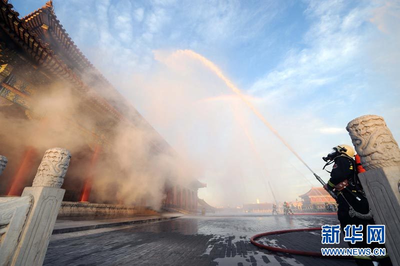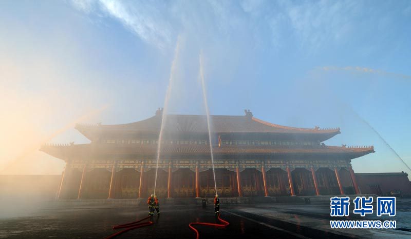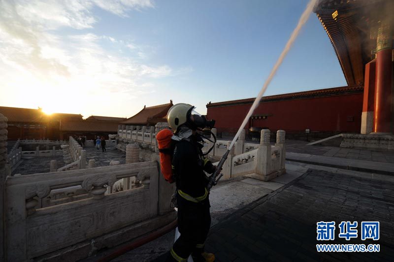 9月27日,北京消防部门在北京故宫太和殿举行消防演习。北京消防部门开展多种形式的灭火救援演练,并加大演练的频次和力度,保障今年“十一”长假期间的消防安全。李文 摄 图片来源:新华网