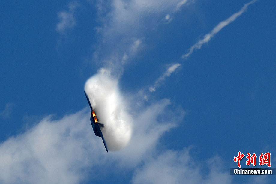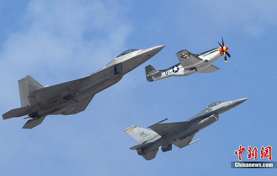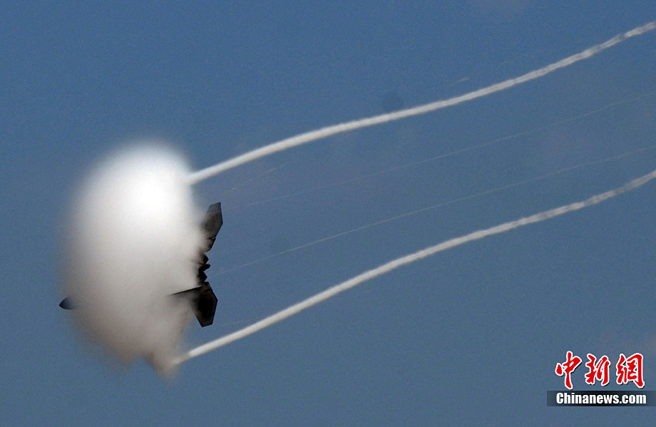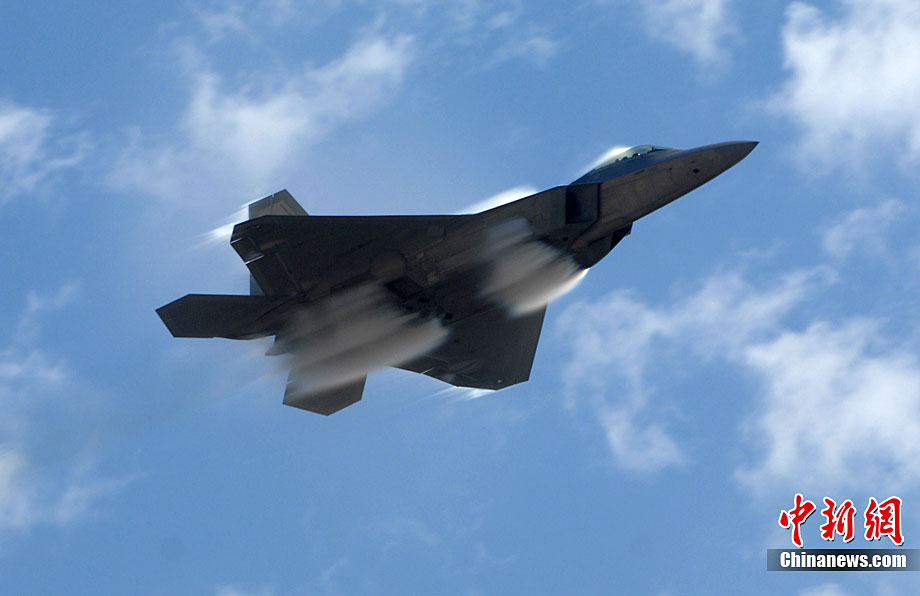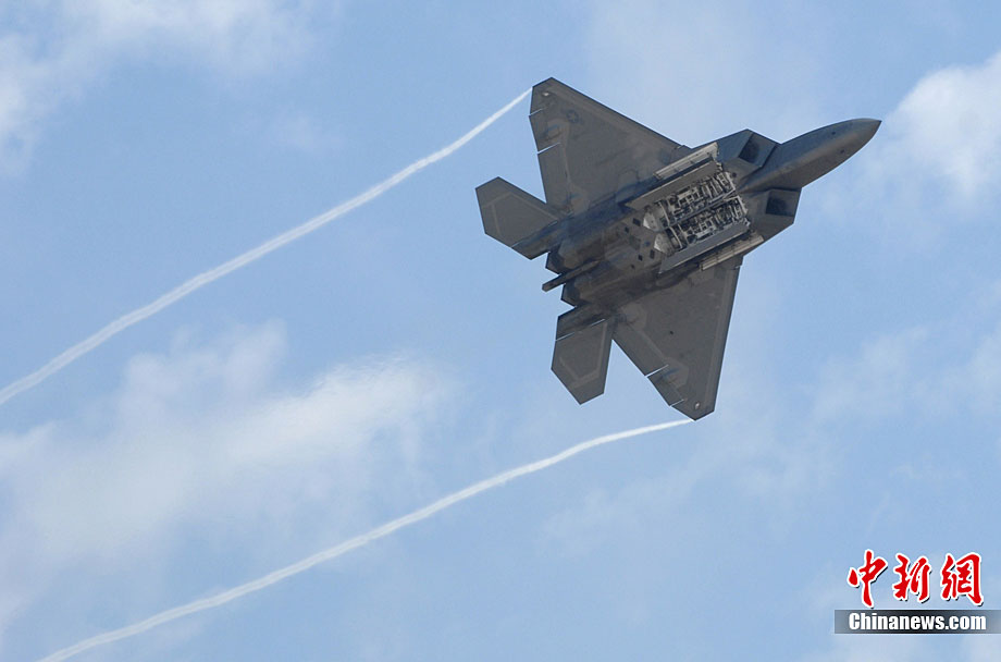 当地时间10月3日,美国著名的密拉玛航空展在加州密拉玛海军陆战队航空基地举行。三天的航空展示和飞行表演吸引了近70万人次参观。图为美军最先进的F-22猛禽战机空中英姿。中新社发 张炜 摄