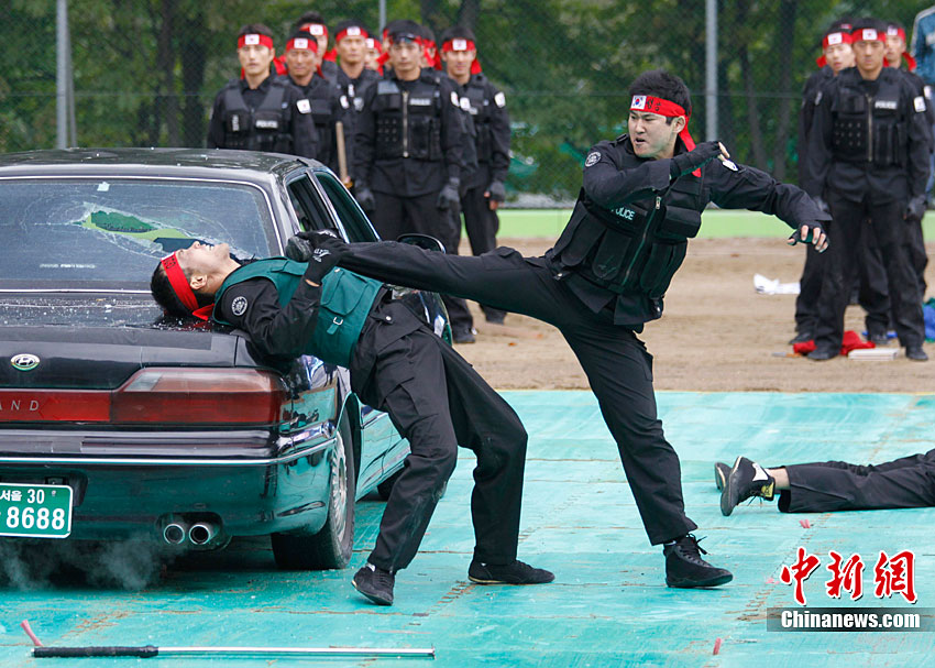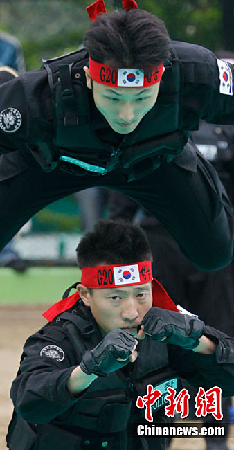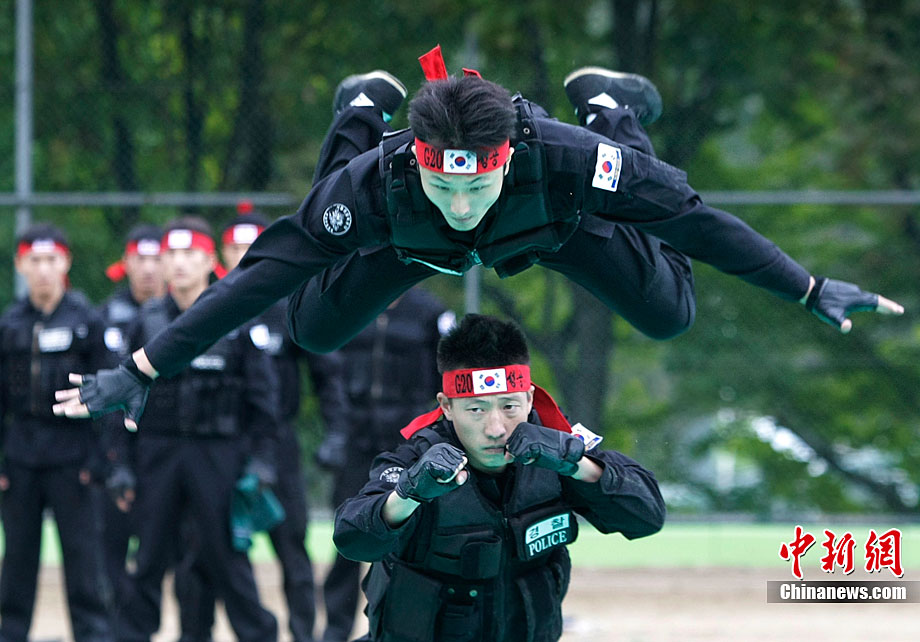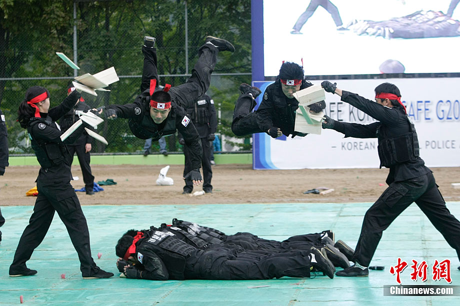 当地时间10月4日,韩国特警在首尔举行了反恐演习。此次演习是为了即将于11月在韩国举行的G20首脑峰会而做的准备工作。
